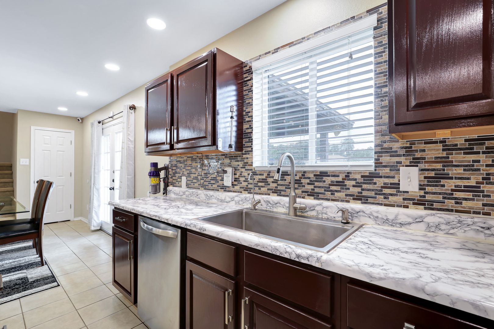 The lower level boasts an open-concept layout with sleek, carpet-free flooring, perfect for a contemporary lifestyle. The kitchen and dining area, equipped with an island, create an inviting space for entertaining.