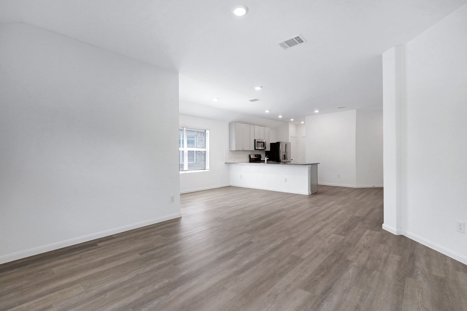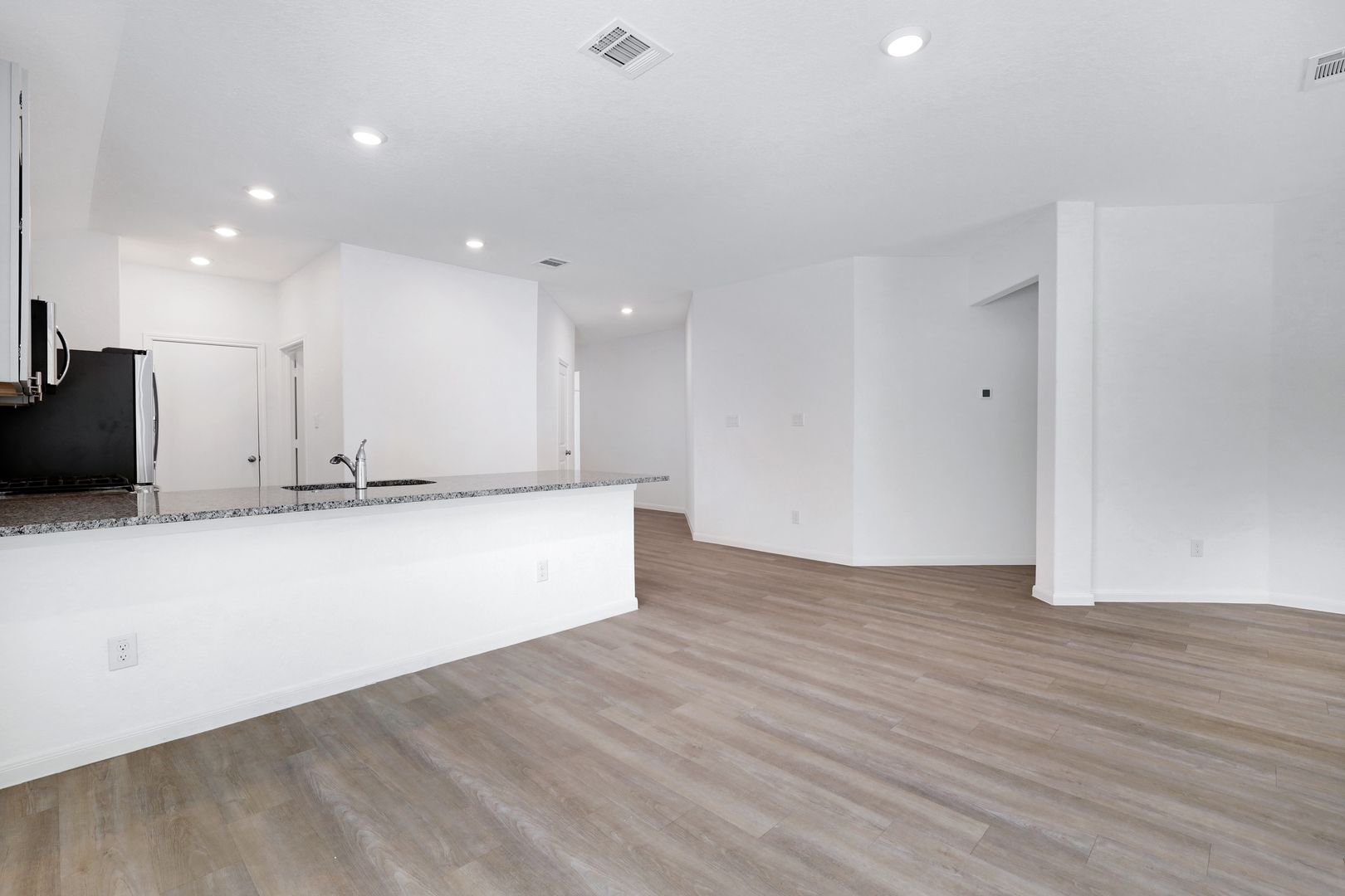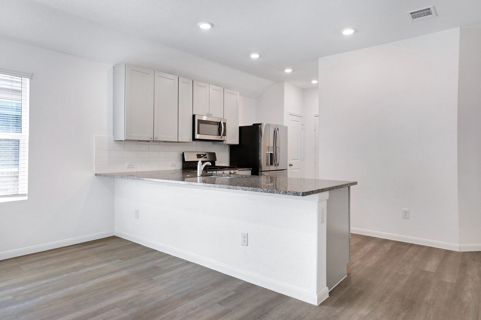 The spacious living area boasts luxury vinyl flooring throughout, providing a clean and contemporary look while being easy to maintain - say goodbye to carpet! Cooking enthusiasts will appreciate the gas stove, granite countertops, and an inviting eat-in kitchen bar. A refrigerator is included, making your move-in process a breeze.