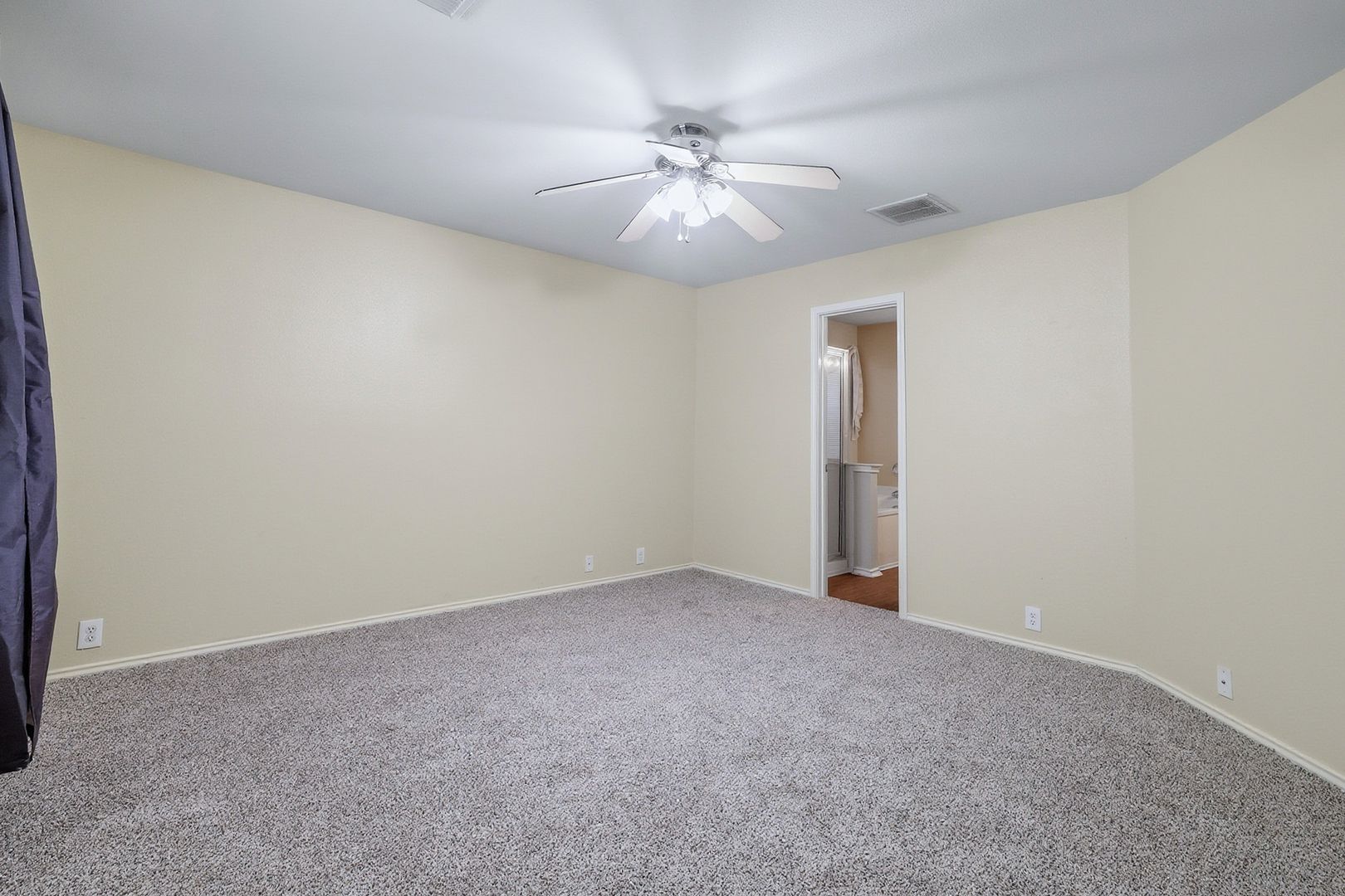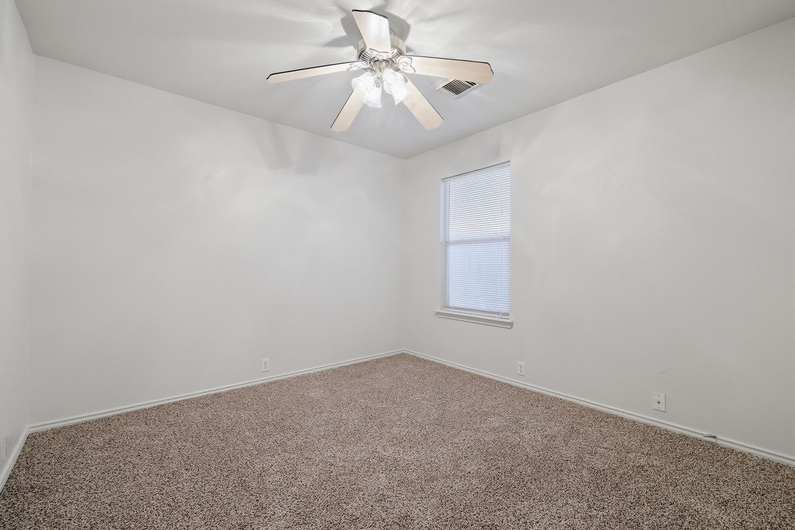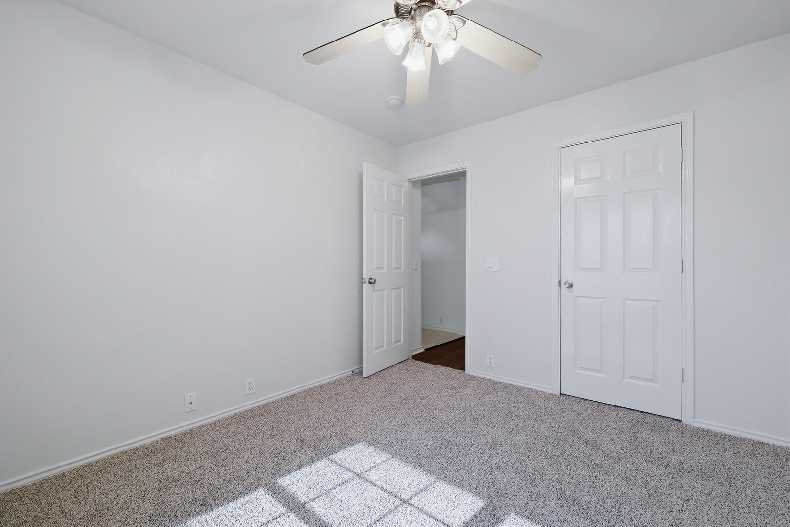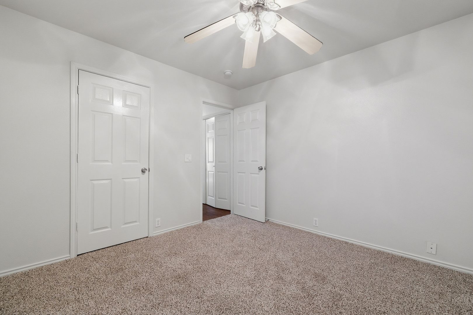 A dedicated office sits behind glass French doors, ideal for remote work or a flex space. The primary suite provides a comfortable retreat with a ceiling fan, separate garden tub and walk-in shower, and a large walk-in closet. Secondary bedrooms are located at the front of the home, creating a thoughtful layout with added privacy.