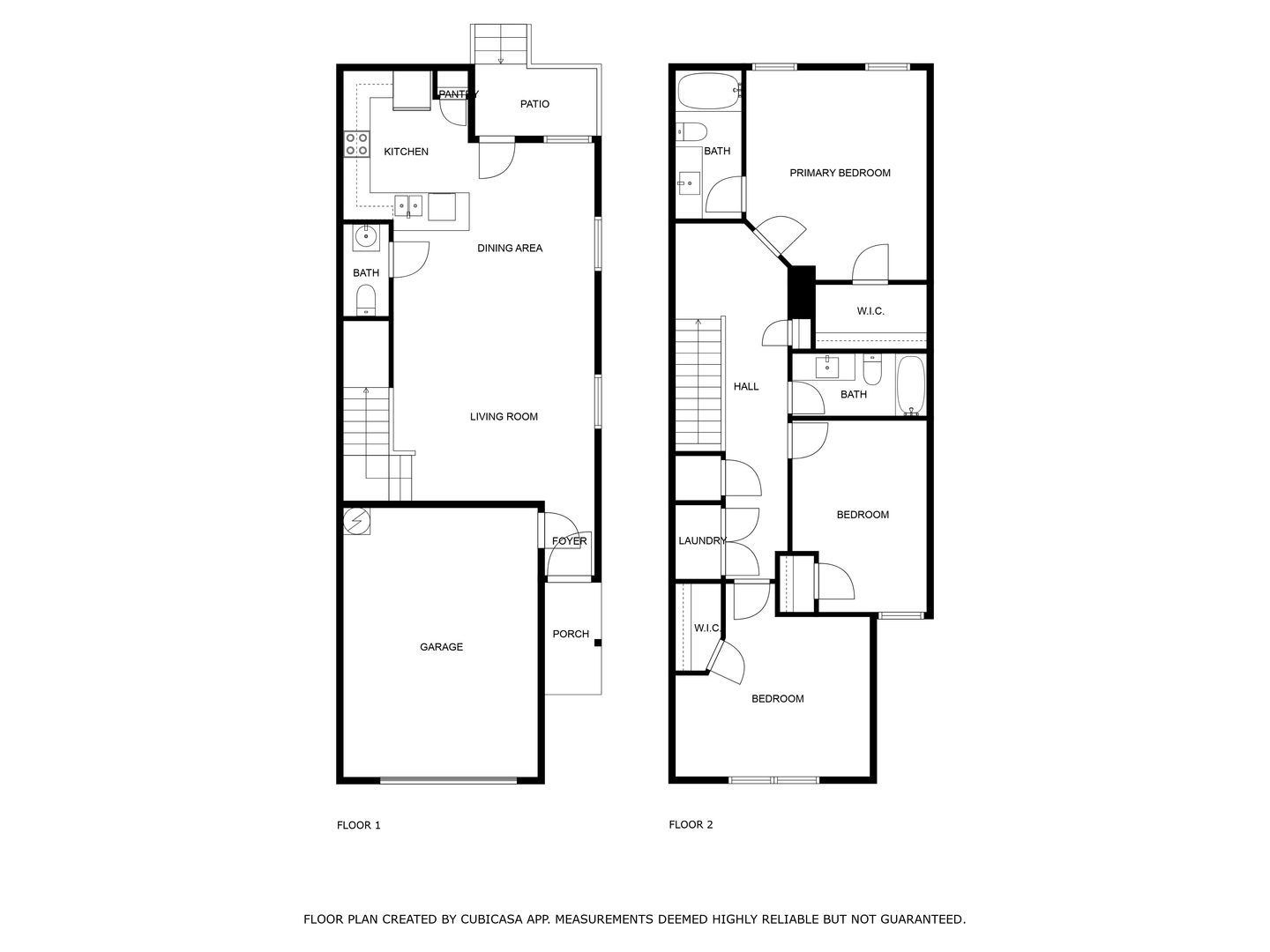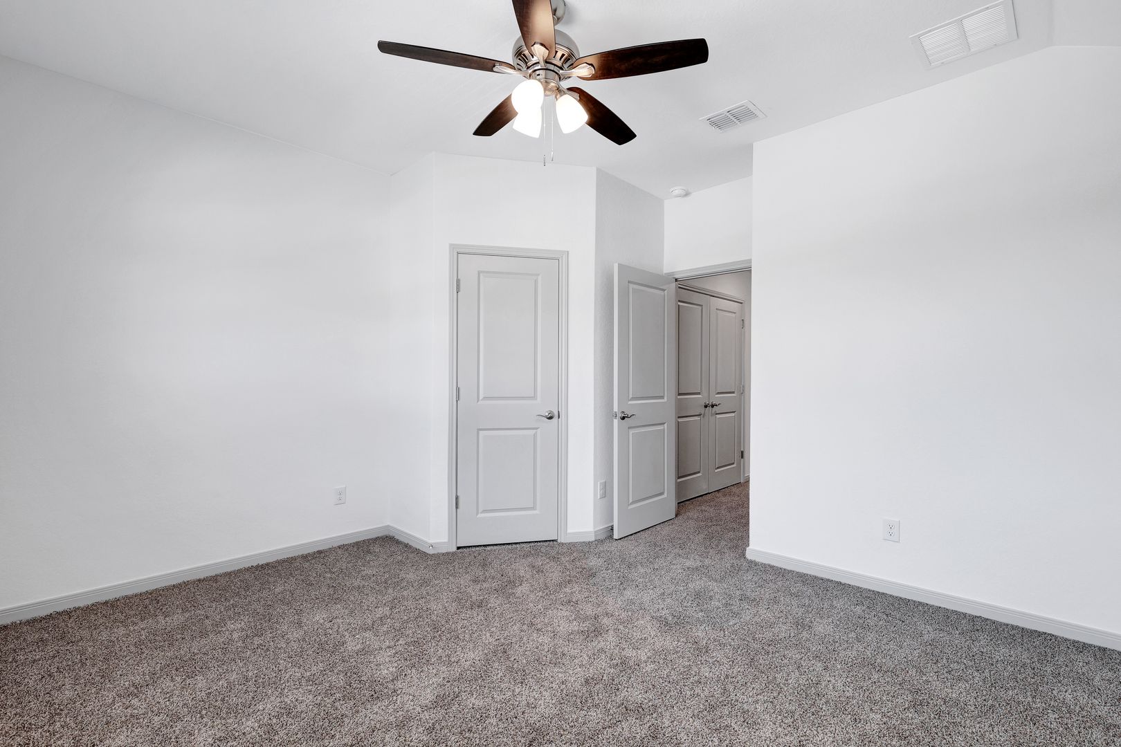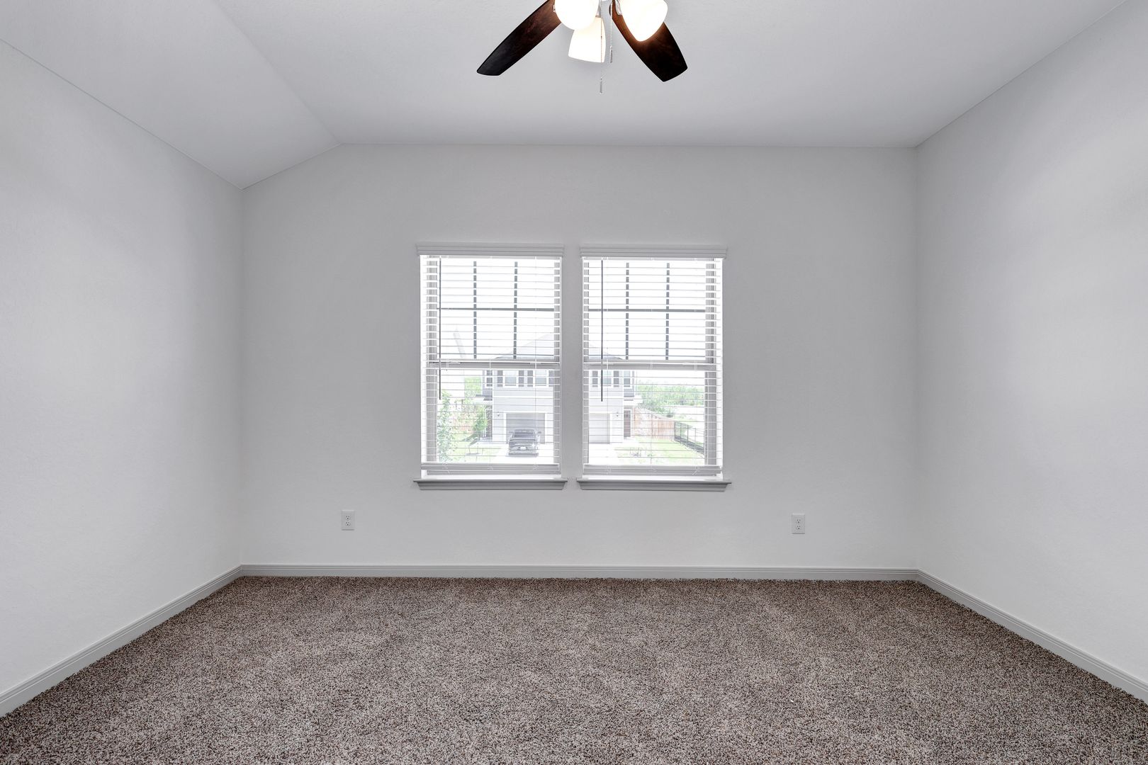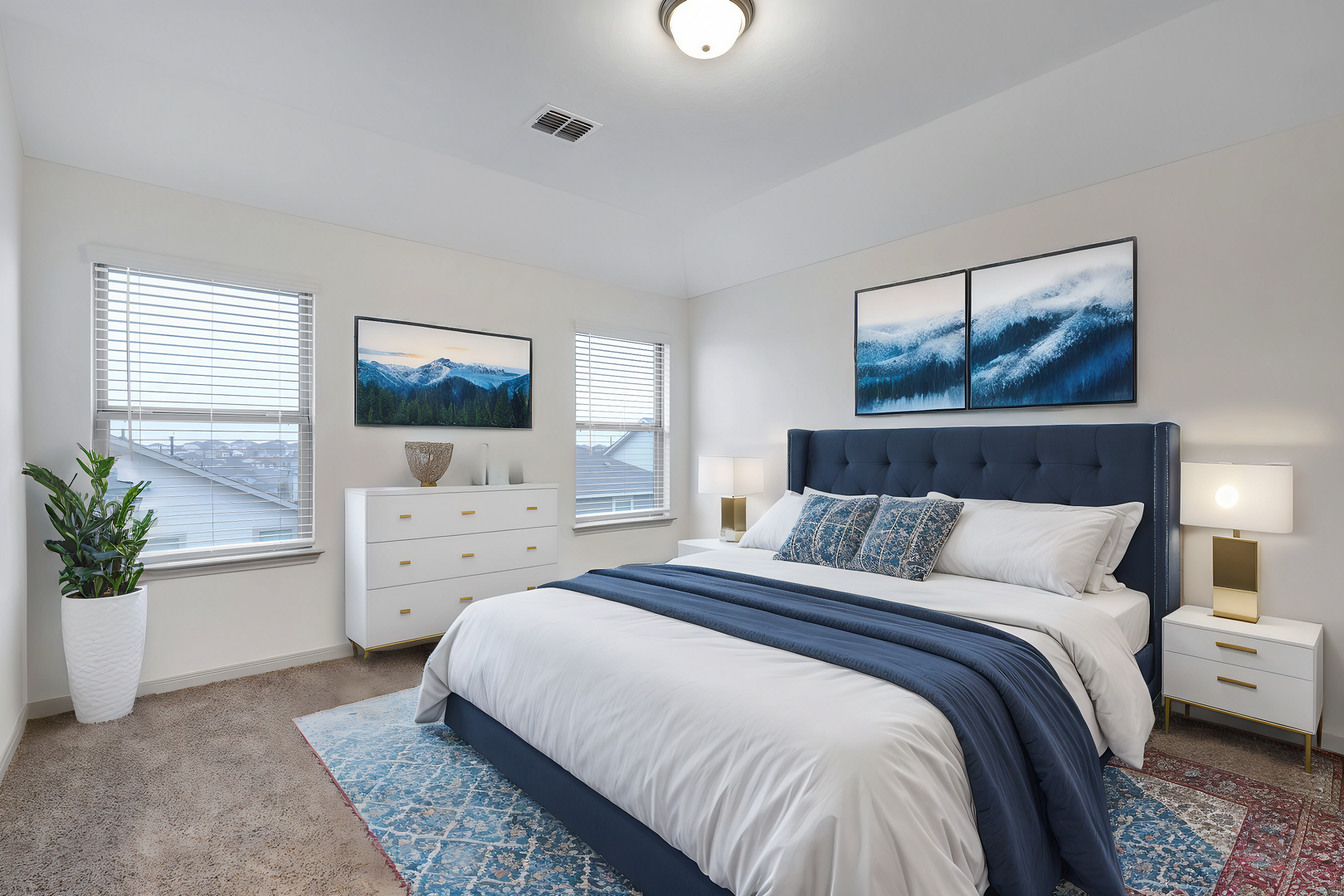 Upstairs, plush carpeting enhances comfort throughout the private living spaces. The primary suite offers a spacious retreat with a full en-suite bath and a walk-in closet. Two additional bedrooms and laundry connections are also located on this level, providing convenience and versatility.