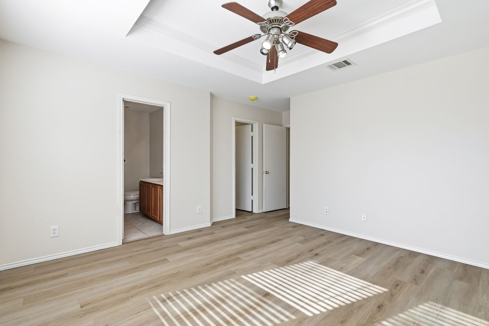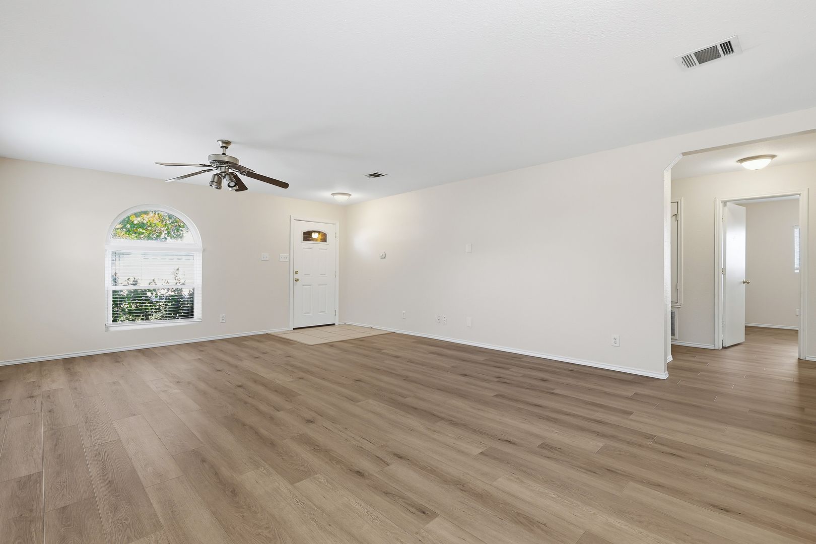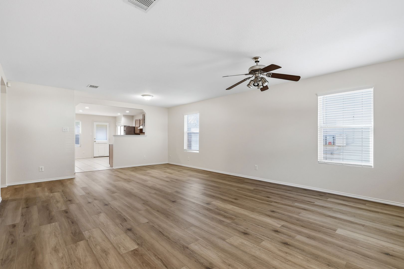 Single-story home located in the desirable Bulverde Creek subdivision. Step inside to discover vinyl plank flooring throughout the main living areas and bedrooms—there is no carpet in this home. The open-concept layout creates a seamless flow, featuring a spacious living area with a designated dining space and an eat-in kitchen, ideal for both everyday living and entertaining. For added convenience, the home includes a refrigerator for an easy move-in experience. The primary suite is a private retreat offering a walk-in closet and an en suite with double vanities. Outdoors, enjoy a large yard and a covered patio, perfect for relaxing or hosting guests. This Bulverde Creek home is move-in ready and offers comfort, style, and convenience.