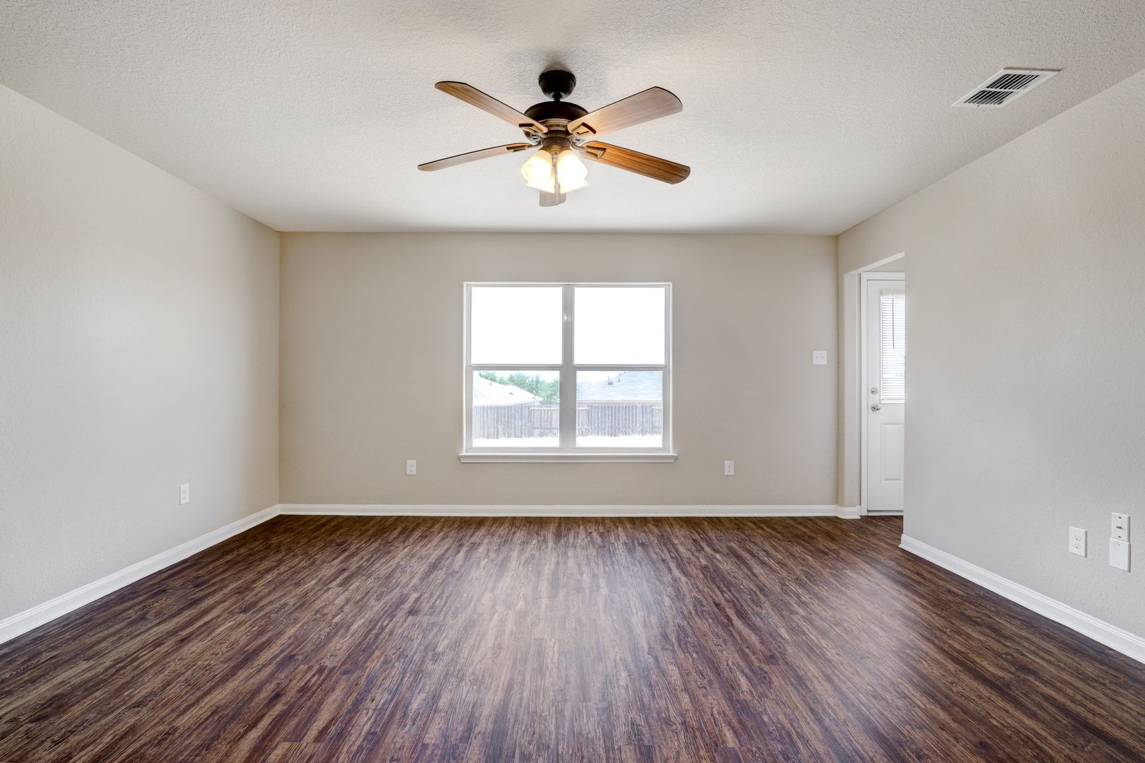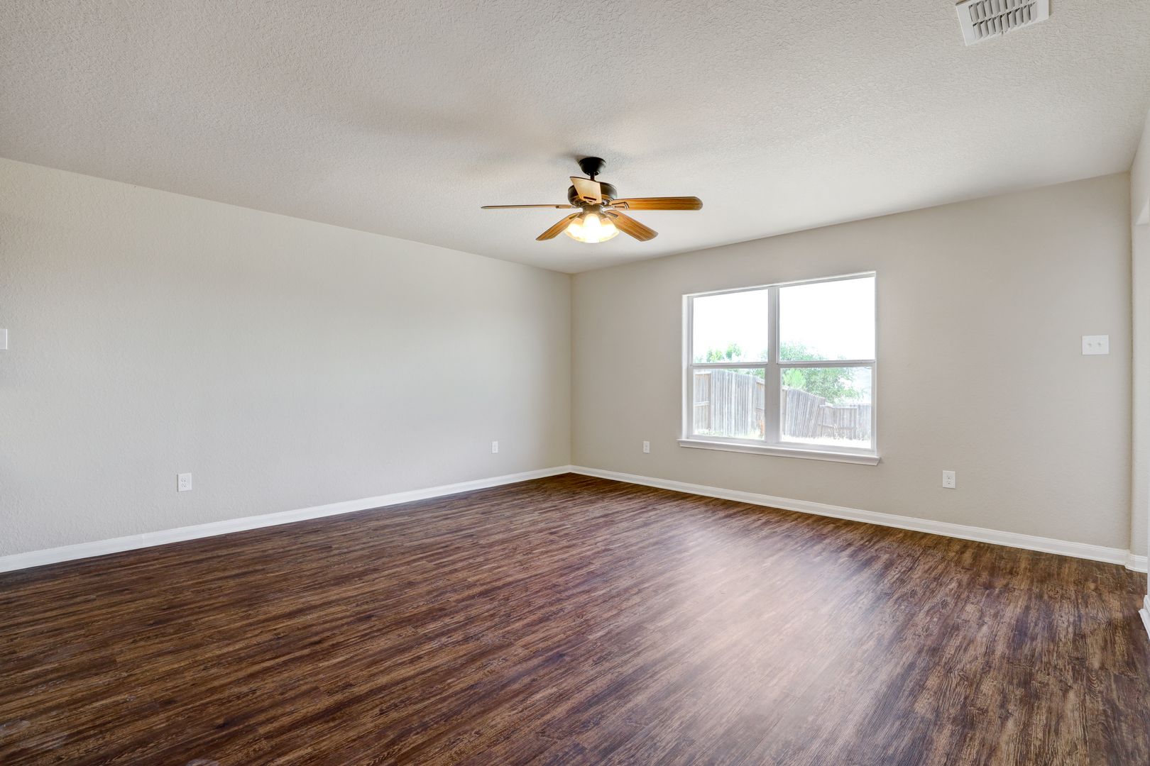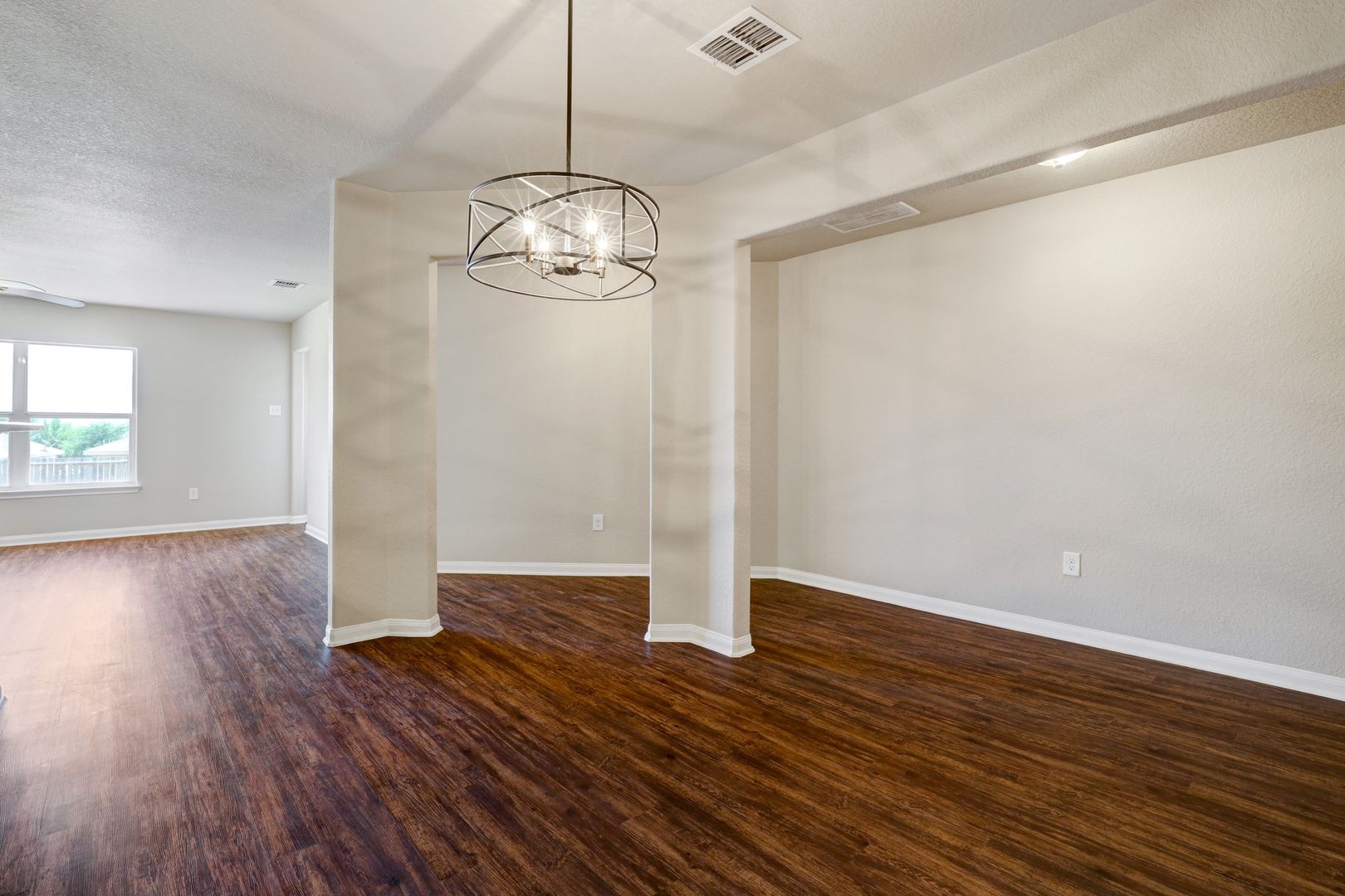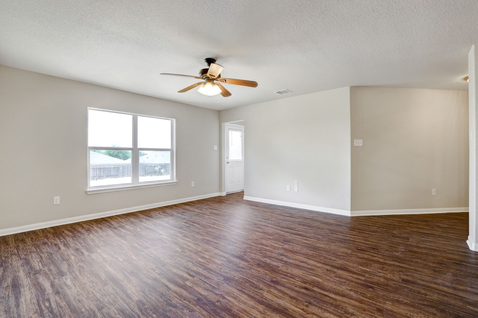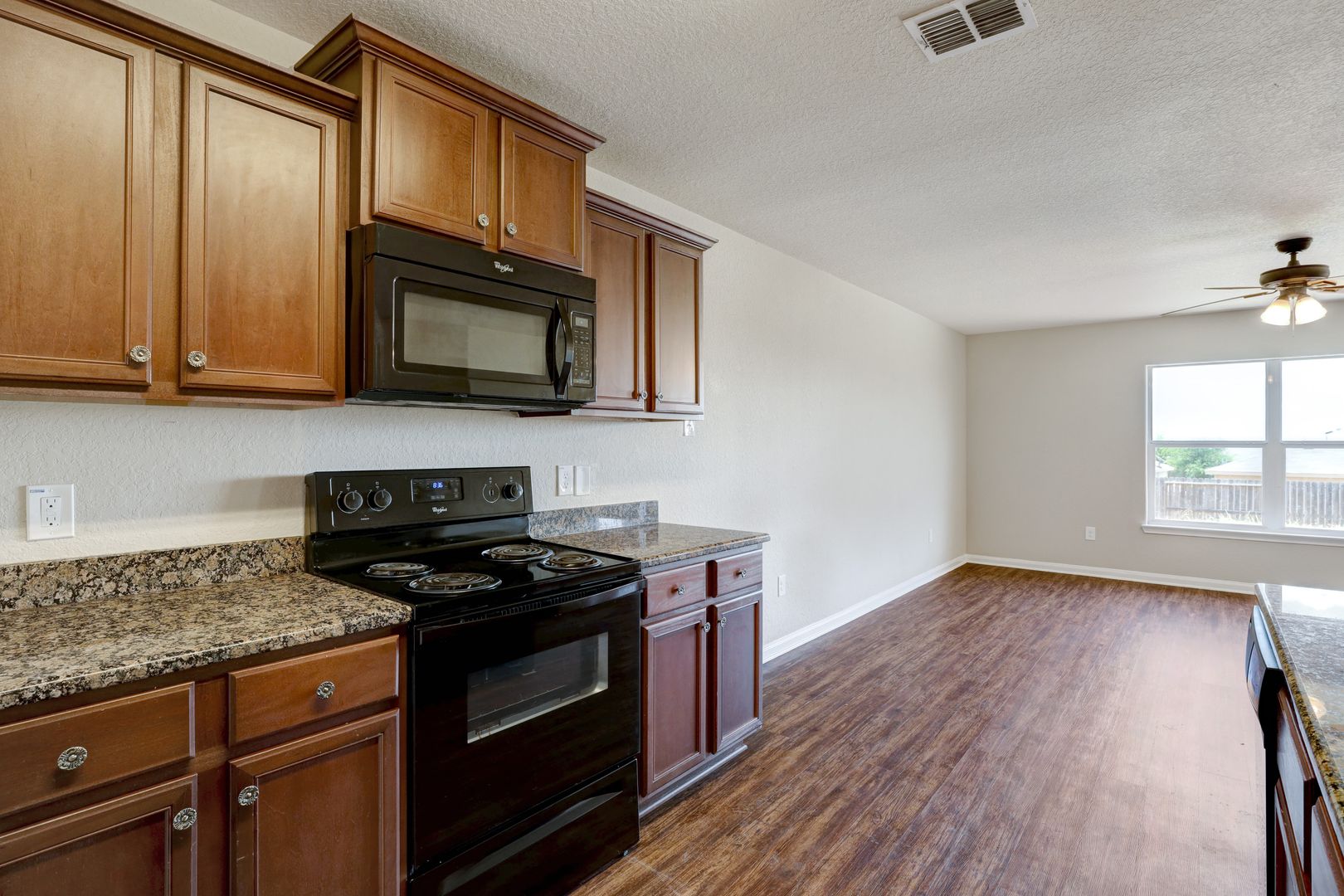 The open floor plan connects the living, dining, and kitchen areas, creating a practical space for everyday living. Ceiling fans are installed throughout the home to help maintain comfort year-round.