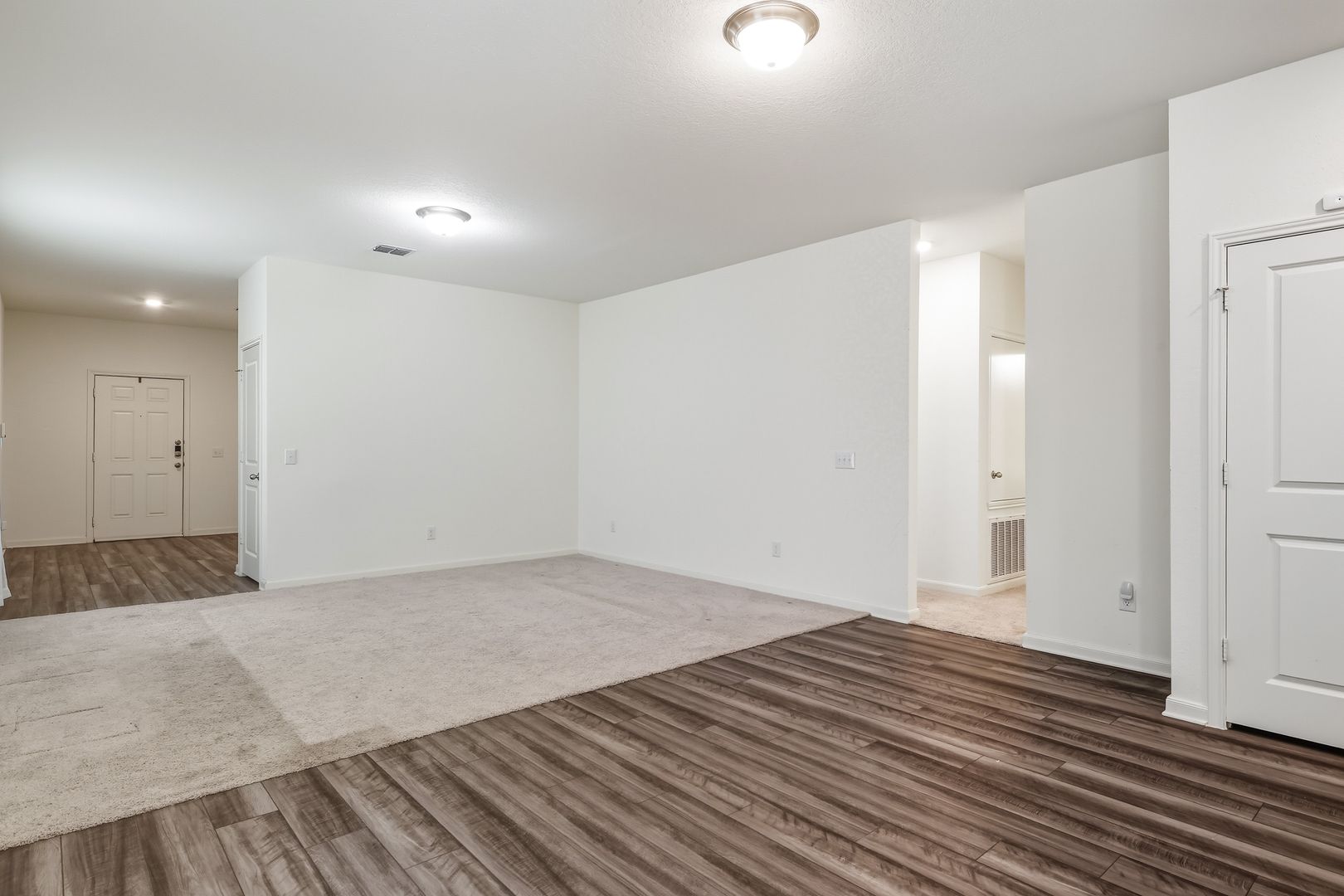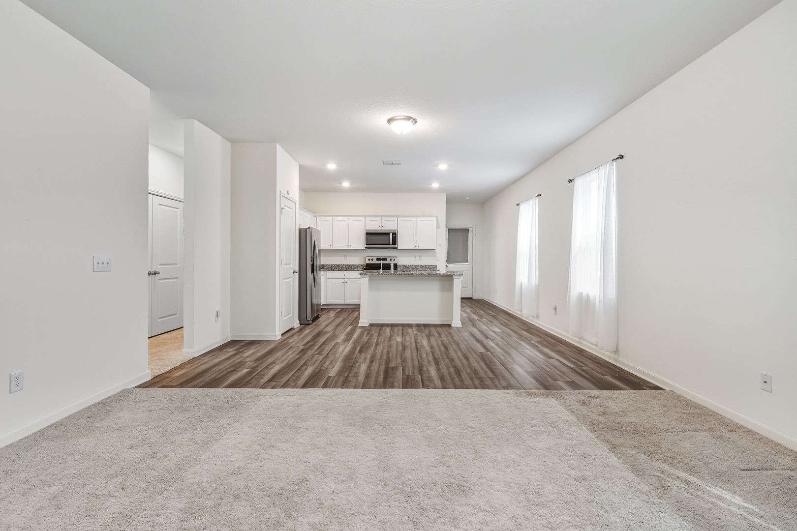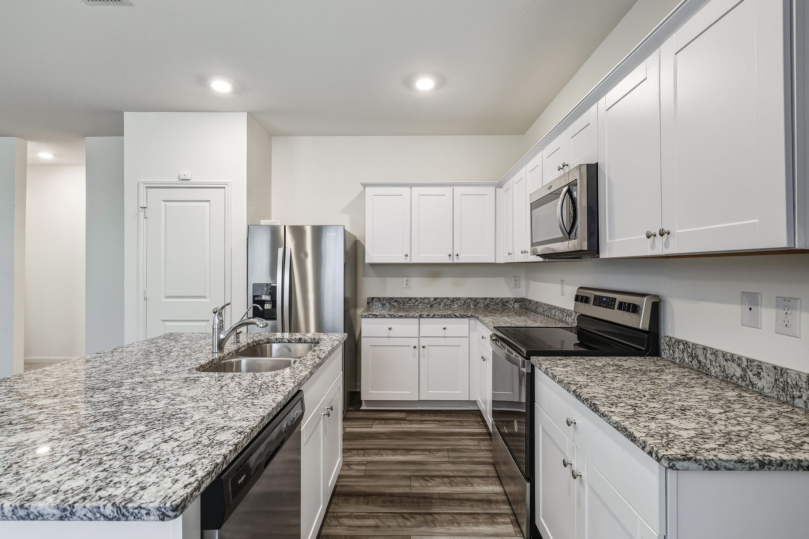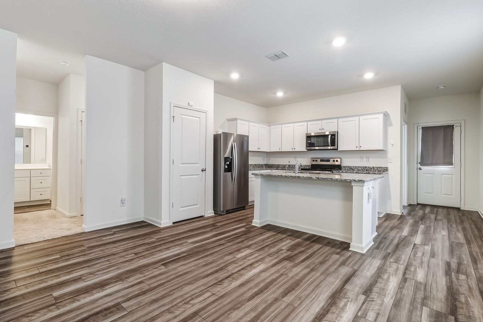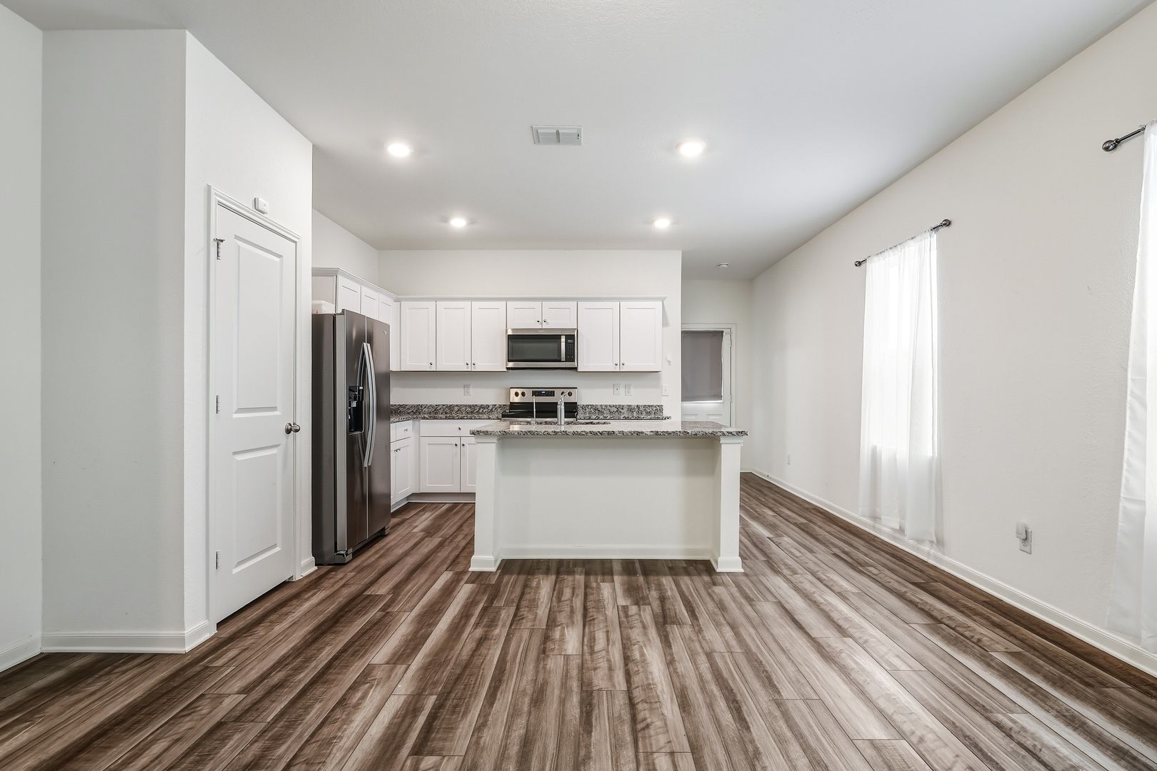 Discover this inviting single-story residence in the desirable Trails at Culebra subdivision. Step inside to find unique luxury vinyl flooring in the entry and kitchen. The kitchen is a standout feature with a center island that includes bar-stool seating and ample workspace. This home comes equipped with essential appliances—including a refrigerator, washer, and dryer—for a smooth and convenient move-in.