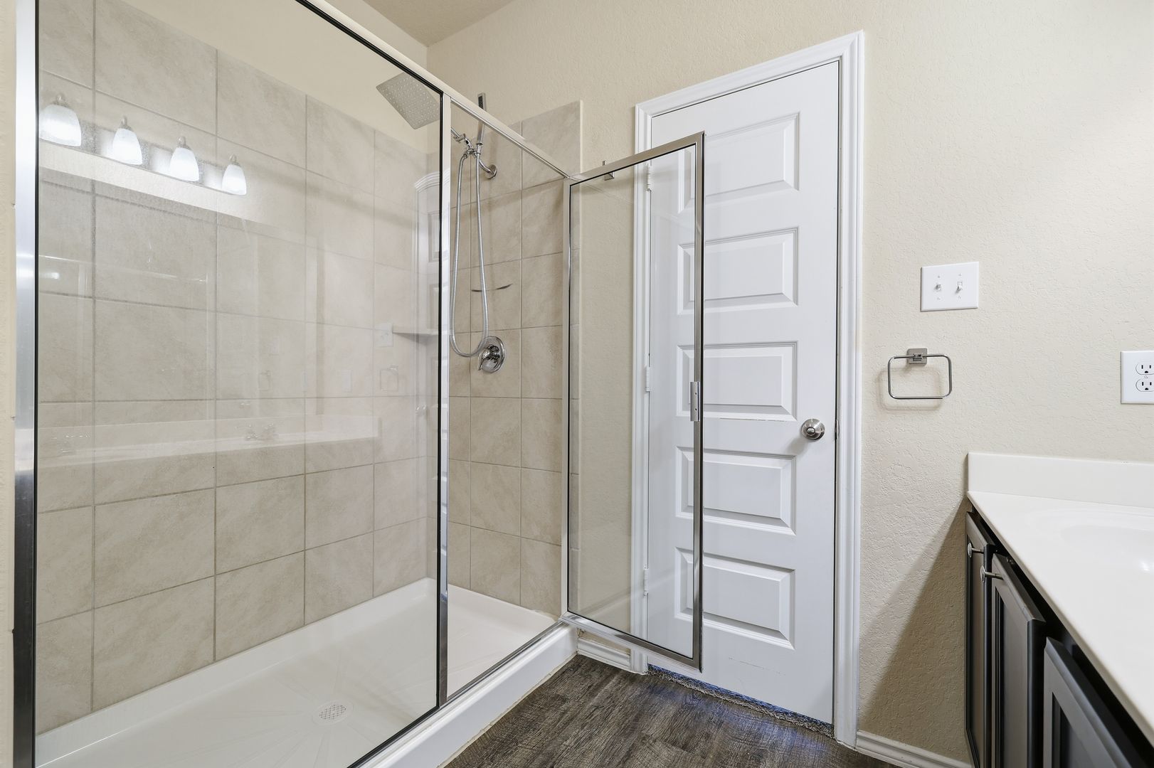 The primary suite is located on the main level and features a double vanity, walk-in shower, and a spacious walk-in closet. Upstairs, a generously sized loft provides flexible living space, along with three additional bedrooms.