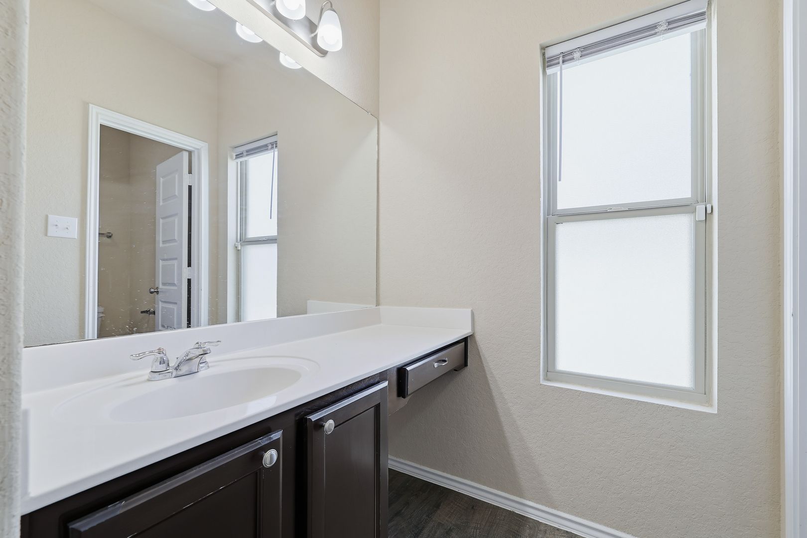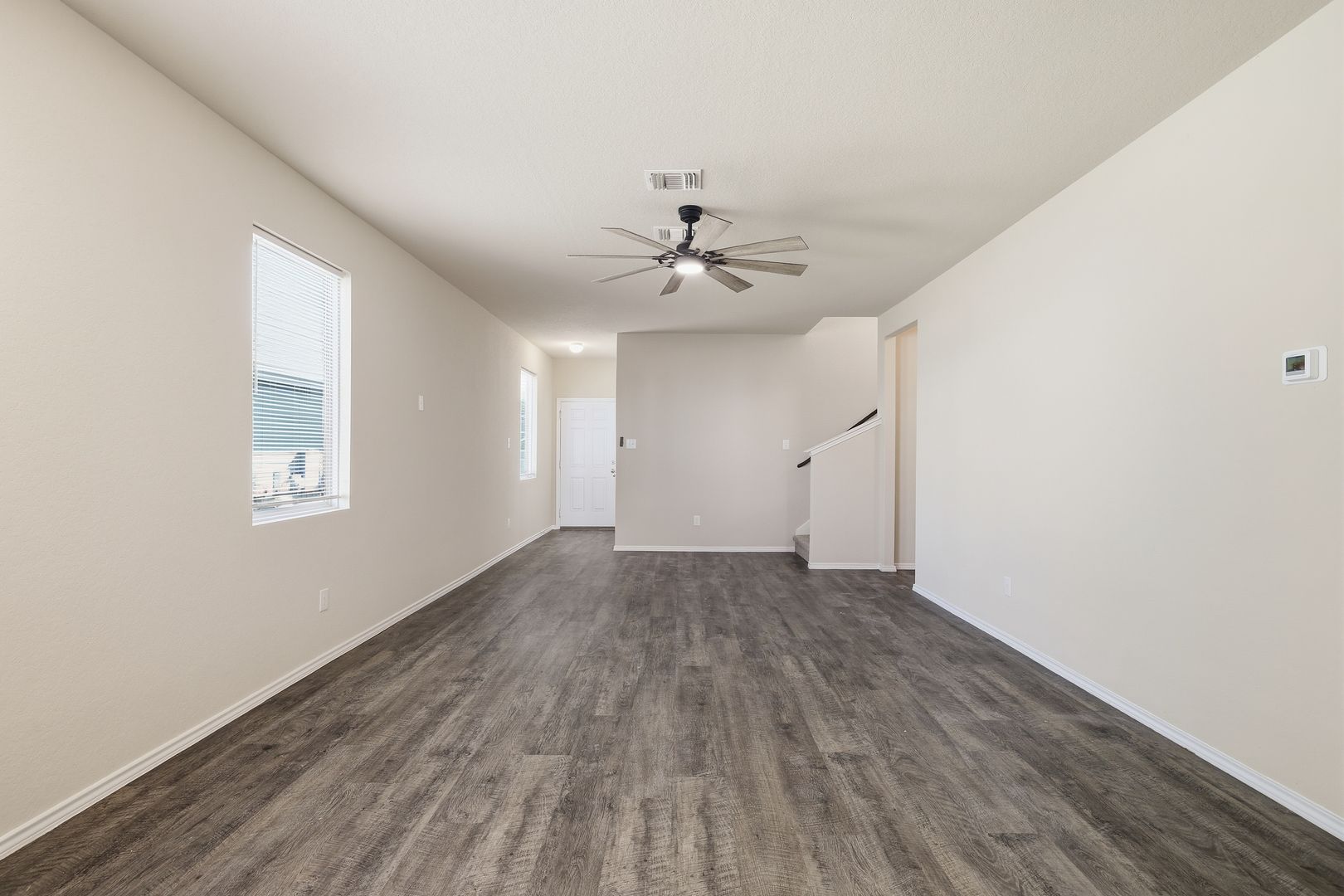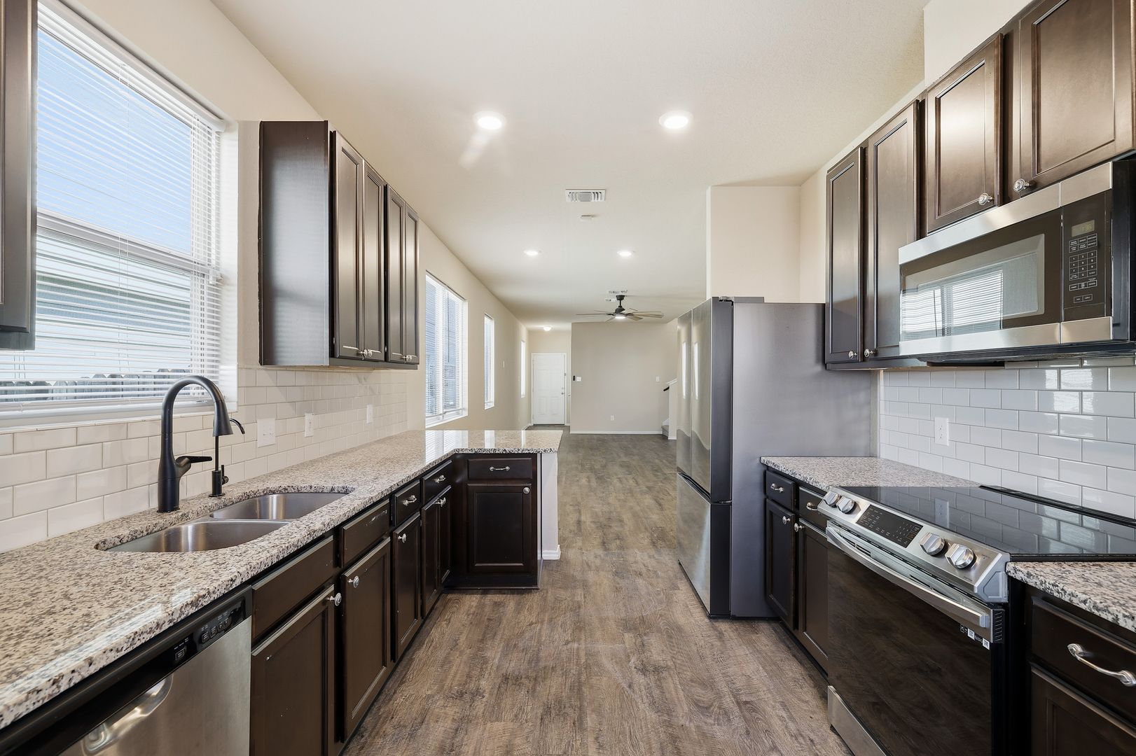 Beautiful two-story home located in the desirable Melissa Ranch subdivision. This residence offers an open-concept main living area enhanced by high ceilings that create a bright, airy atmosphere. The modern kitchen is thoughtfully designed with rich chocolate-brown cabinetry, granite countertops, stainless steel appliances, and convenient bar-stool seating—perfect for casual dining or entertaining.