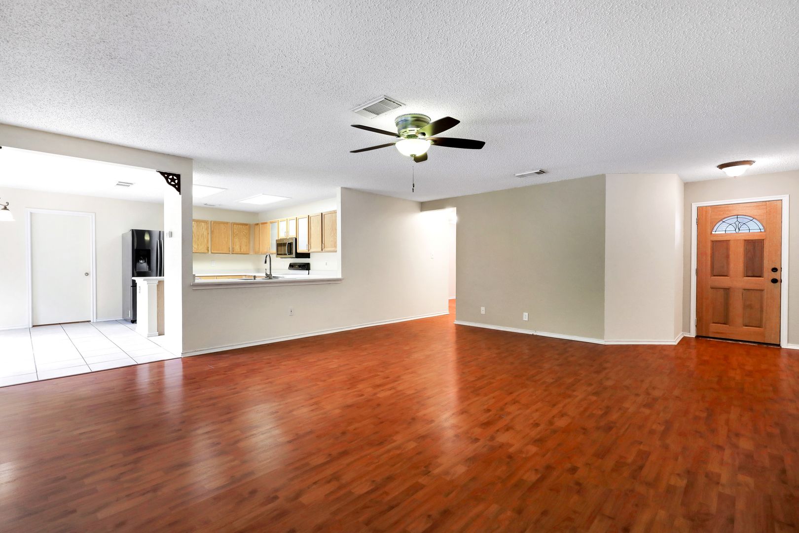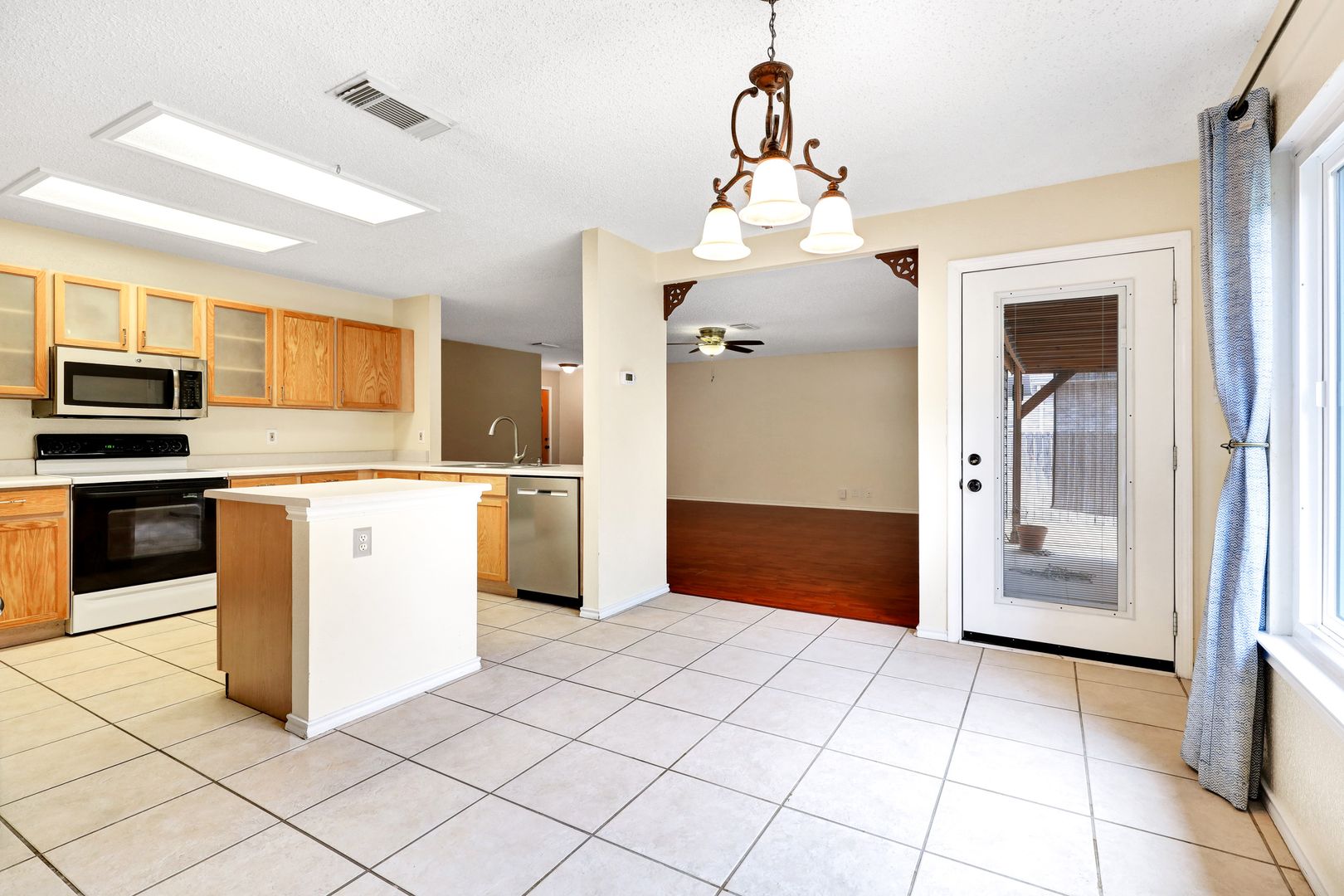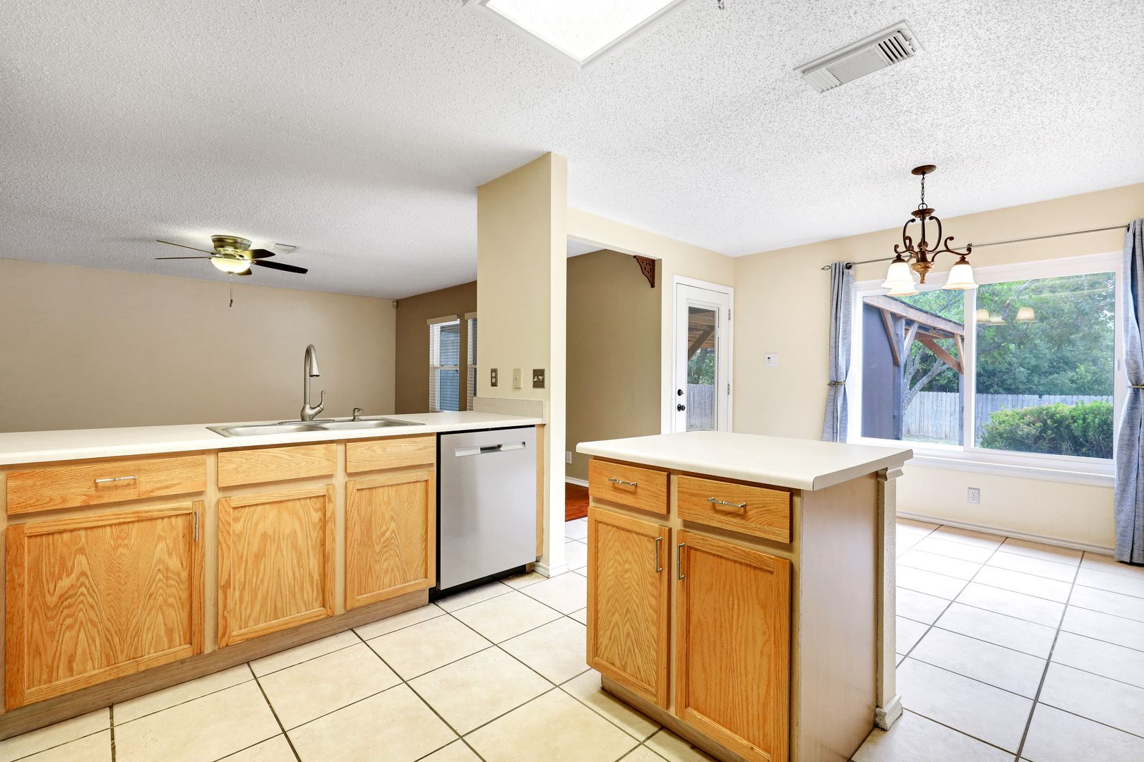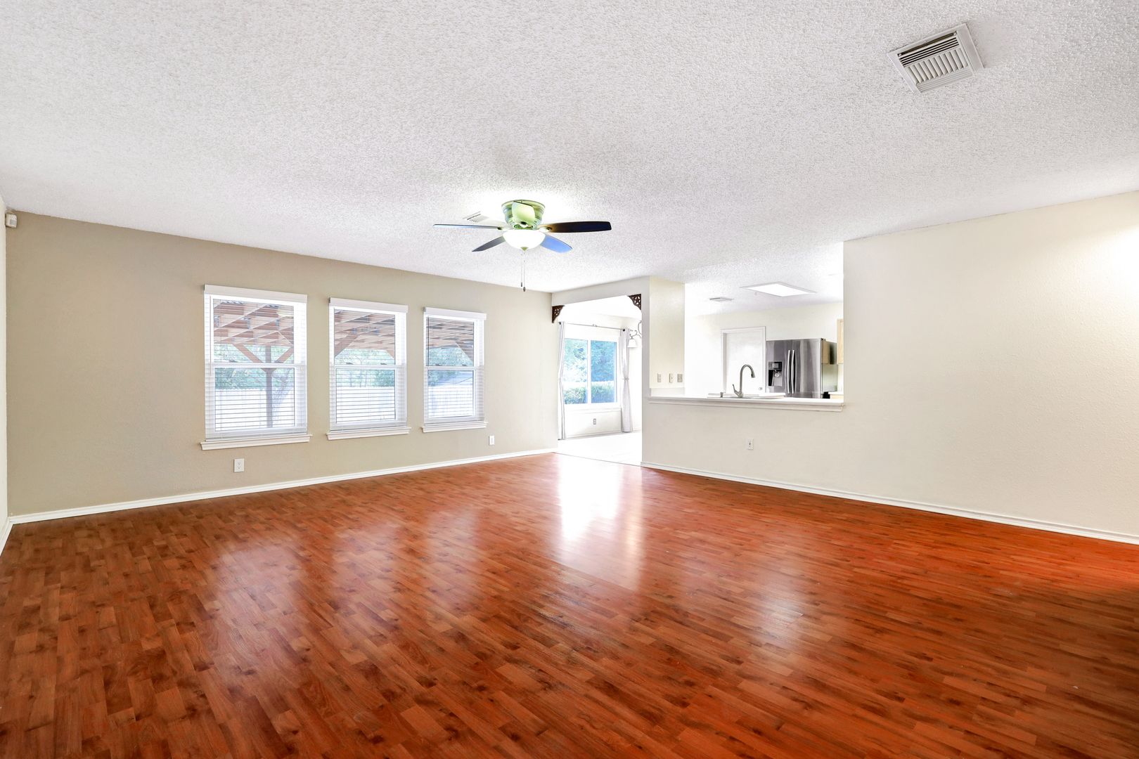 Inside, the open-concept layout offers a functional flow with sleek, easy-to-maintain flooring throughout—no carpet. Ceiling fans are installed throughout for added comfort, and recent upgrades include low-E windows and a newer HVAC system for improved energy efficiency.