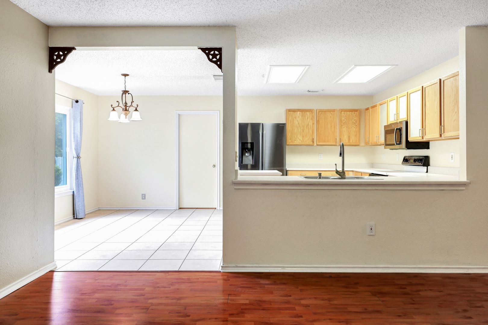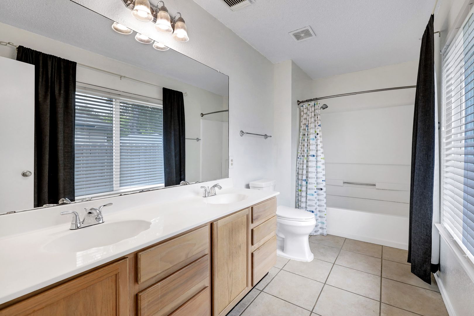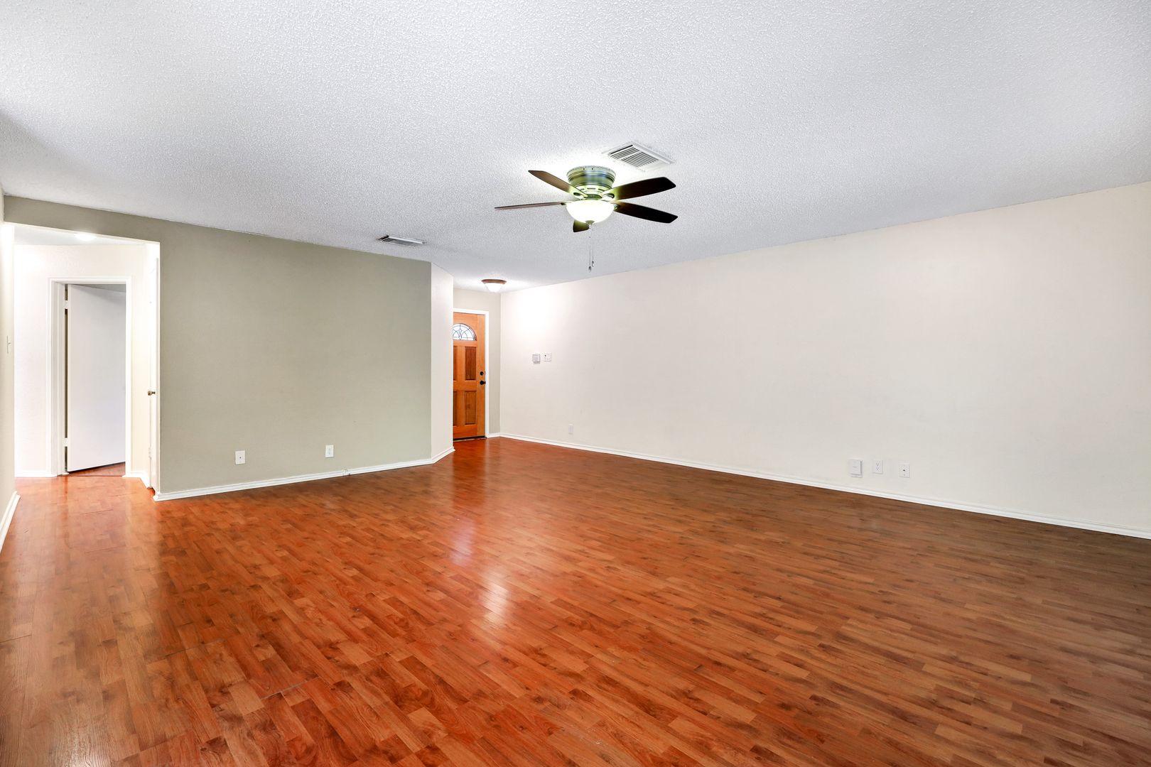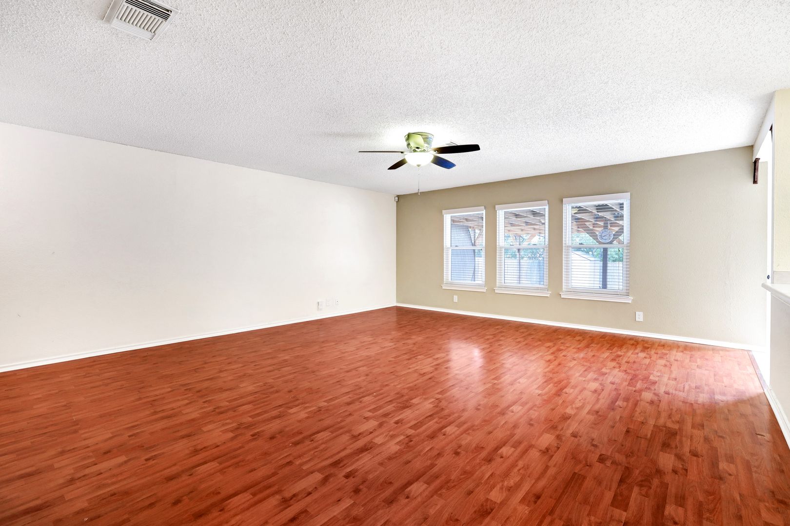 Inside, the open-concept layout offers a functional flow with sleek, easy-to-maintain flooring throughout—no carpet. Ceiling fans are installed throughout for added comfort, and recent upgrades include low-E windows and a newer HVAC system for improved energy efficiency.