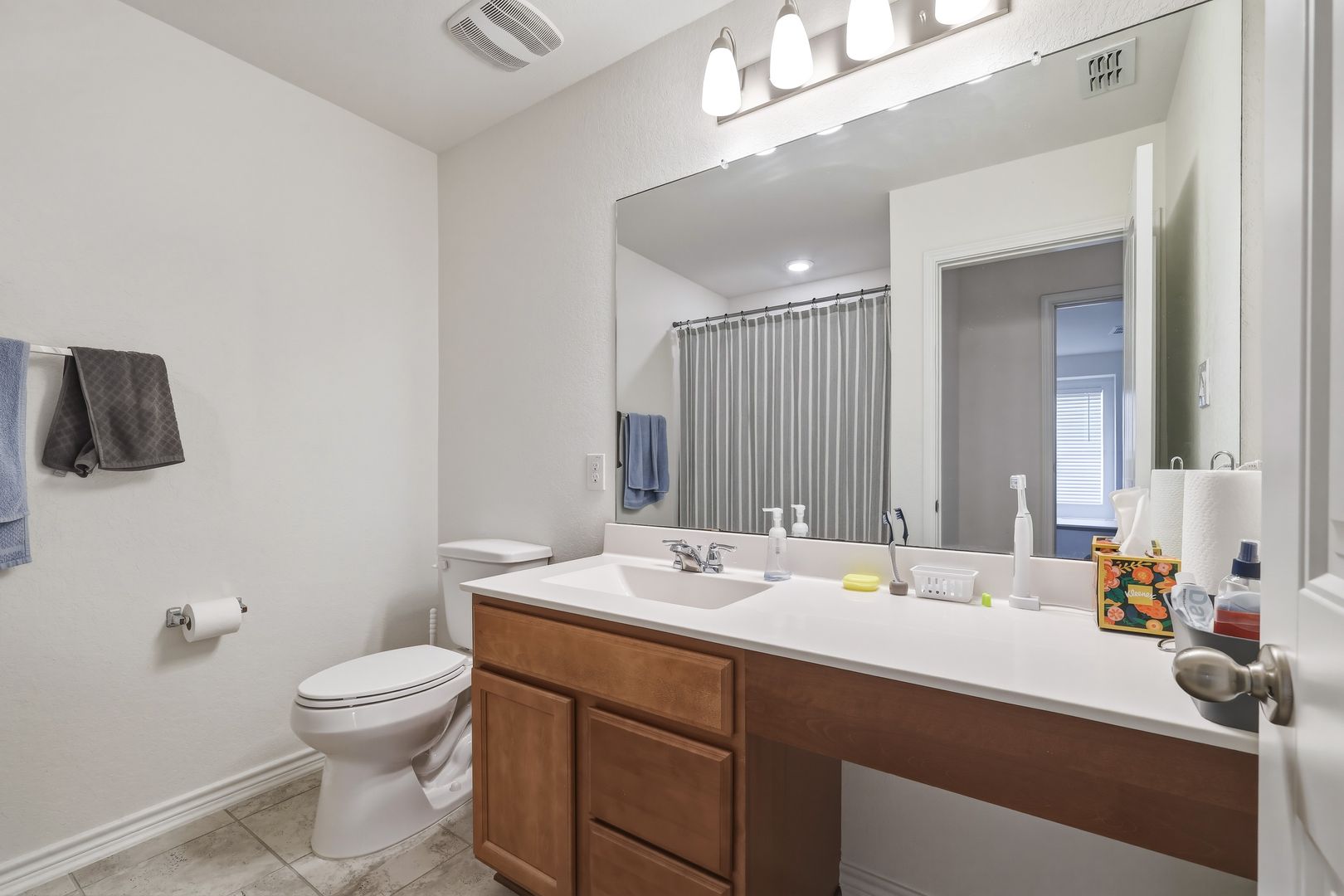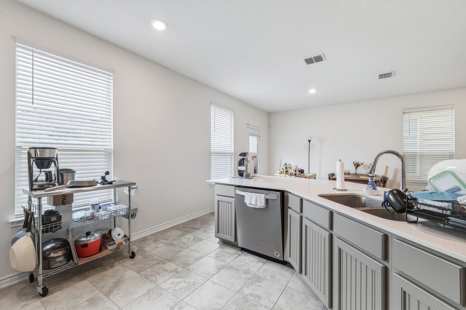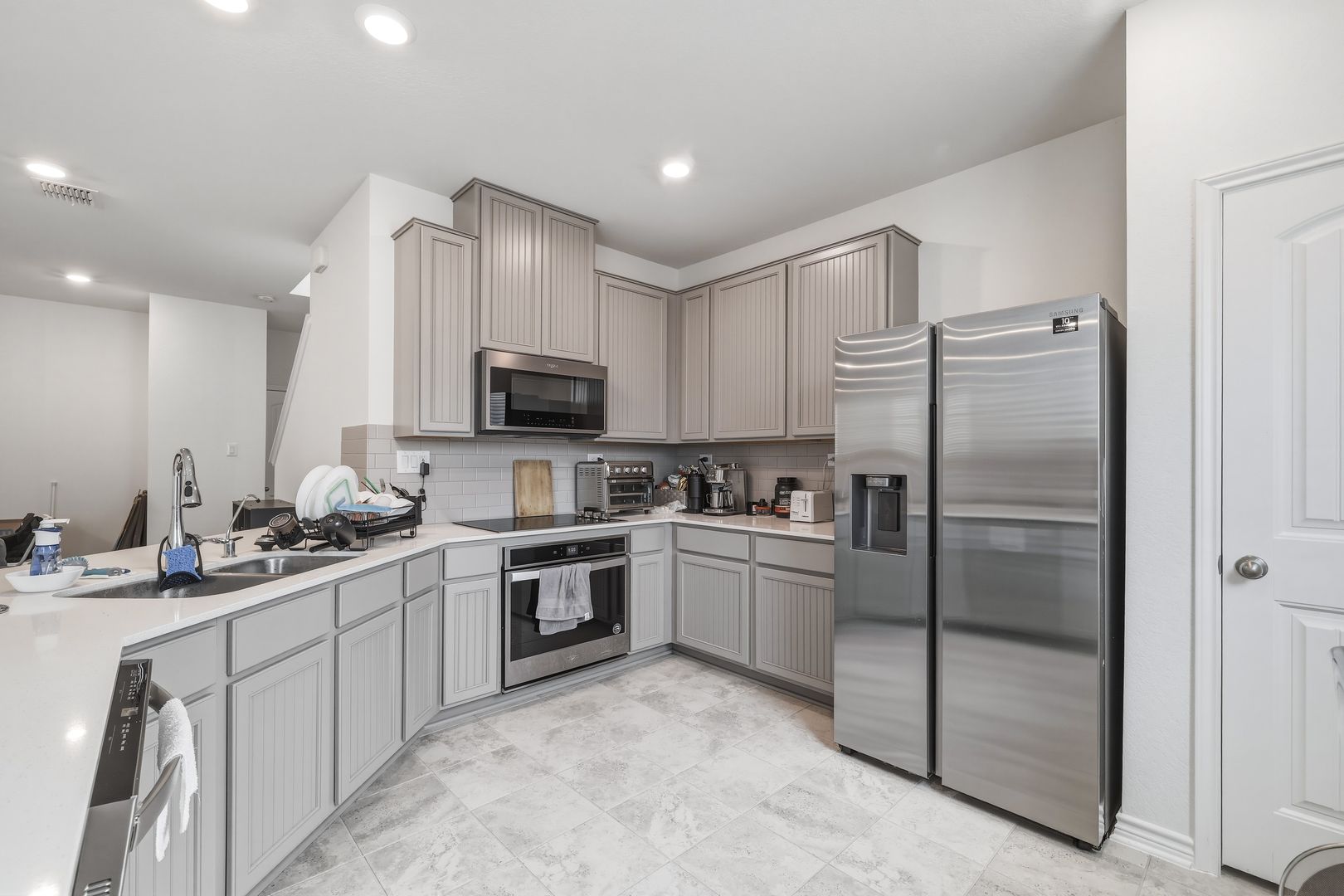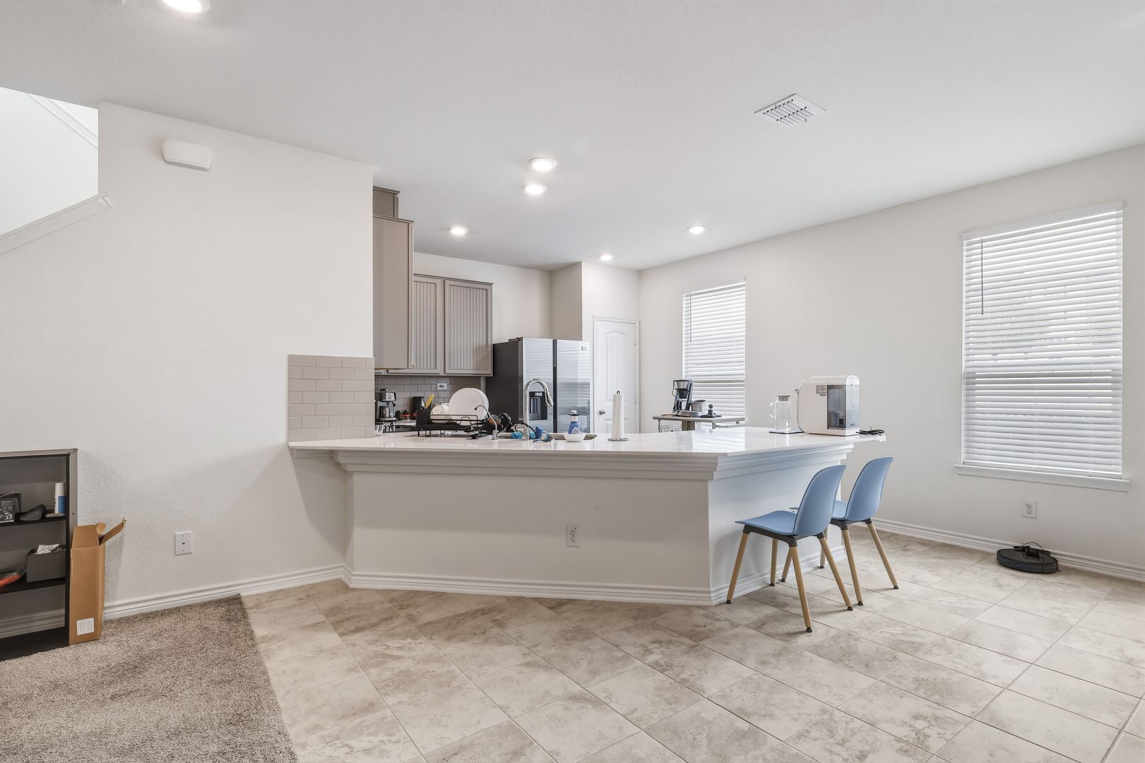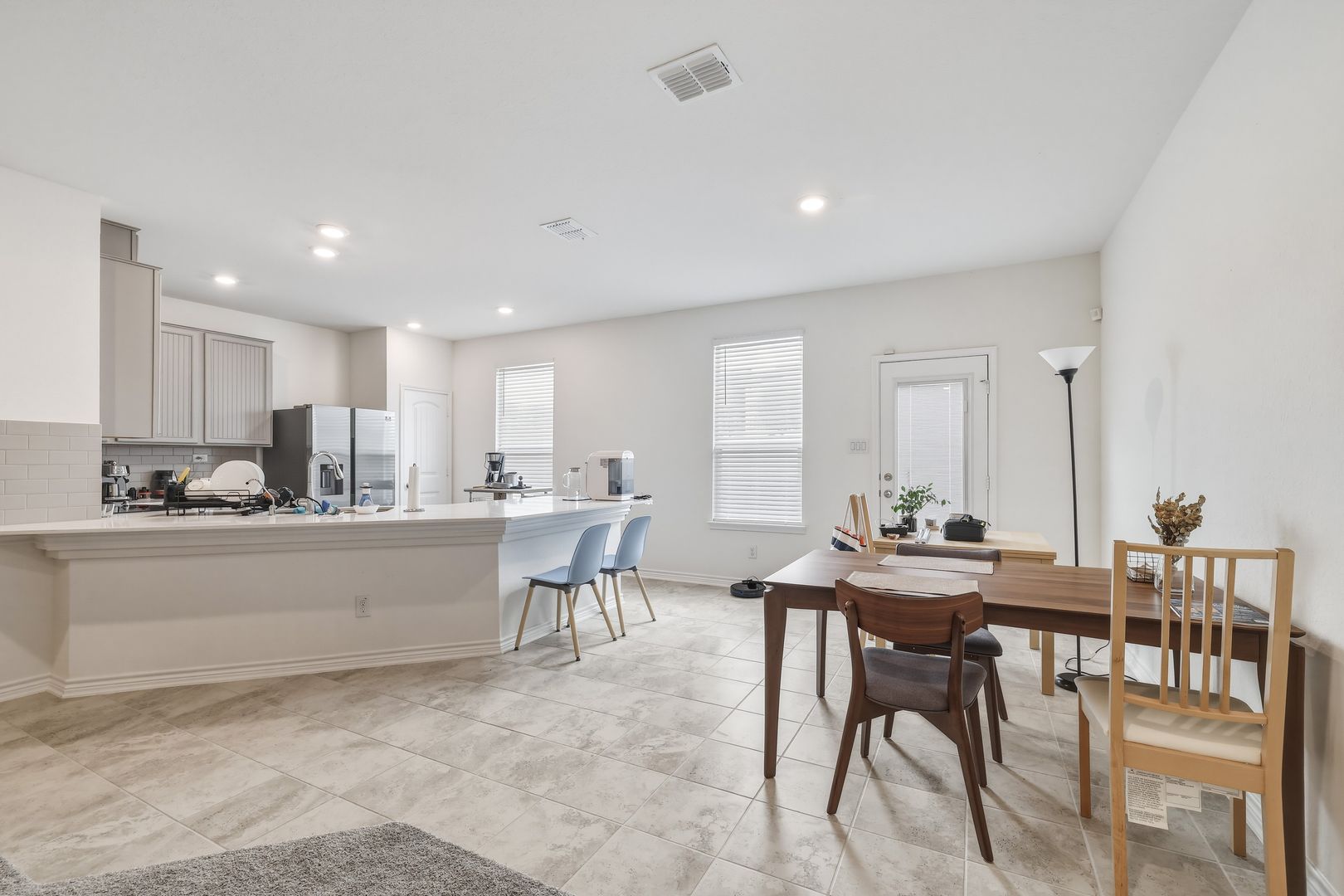 Located in the gated community of Eckhert Crossing, this well-appointed home offers convenient access to the Medical Center, major highways, shopping, dining, and everyday essentials. Step inside to discover high ceilings and an open-concept main living area designed for both comfort and functionality. The kitchen stands out with a large peninsula that doubles as bar stool seating, along with ample counter and cabinet space. All essential appliances are included—refrigerator, washer, and dryer—making move-in simple and convenient.