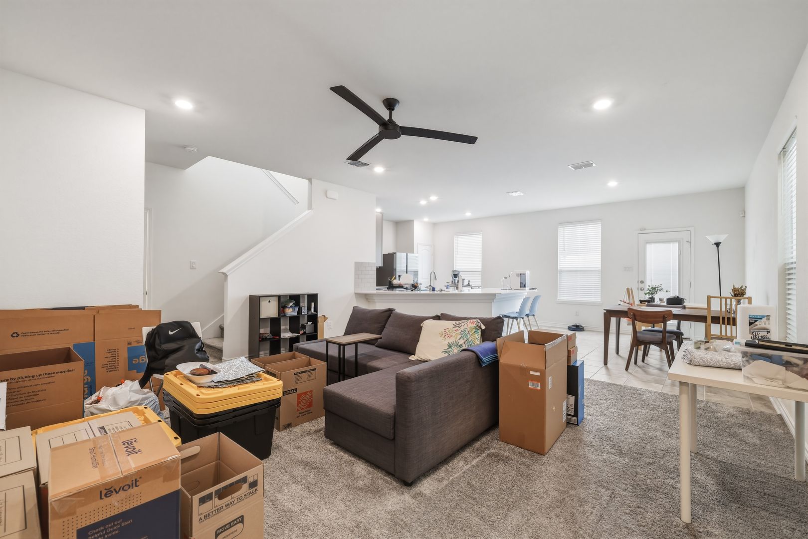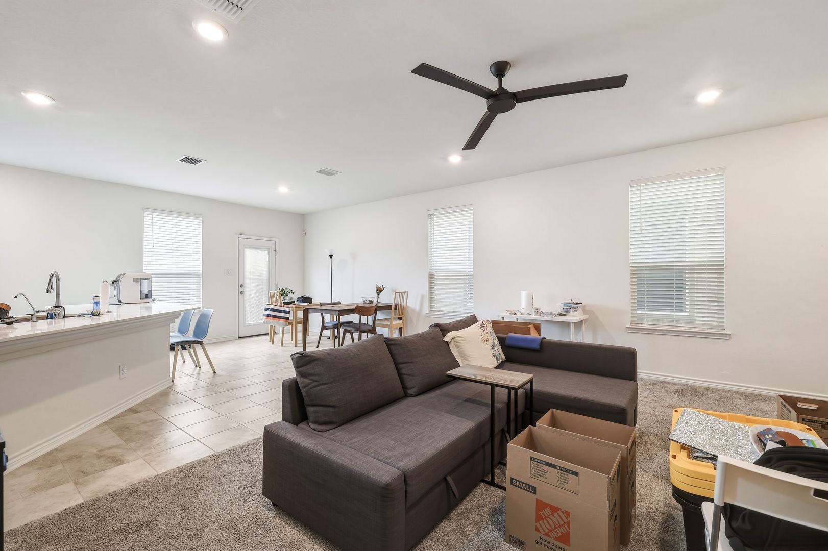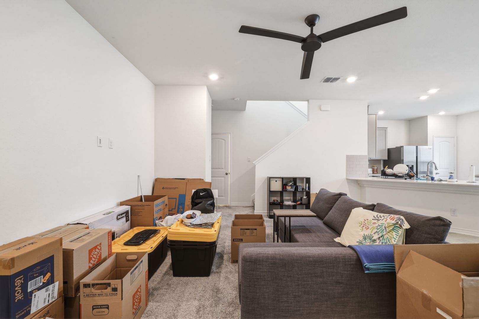 Additional features include a sprinkler system and water softener for added ease of maintenance. Upstairs, a versatile flex space provides the perfect spot for a home office, second living area, or hobby space. All bedrooms are located on the upper level for added privacy. The primary suite includes a ceiling fan, double vanity, and a spacious walk-in closet. Residents of Eckhert Crossing also enjoy gated access and a community dog park. This property offers a great combination of comfort, practicality, and location.