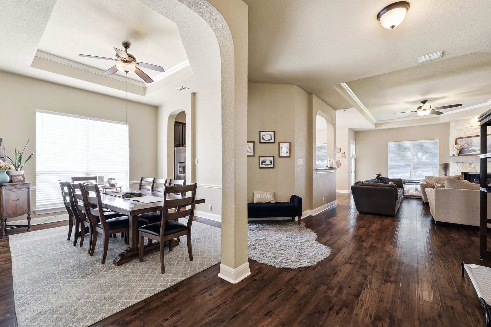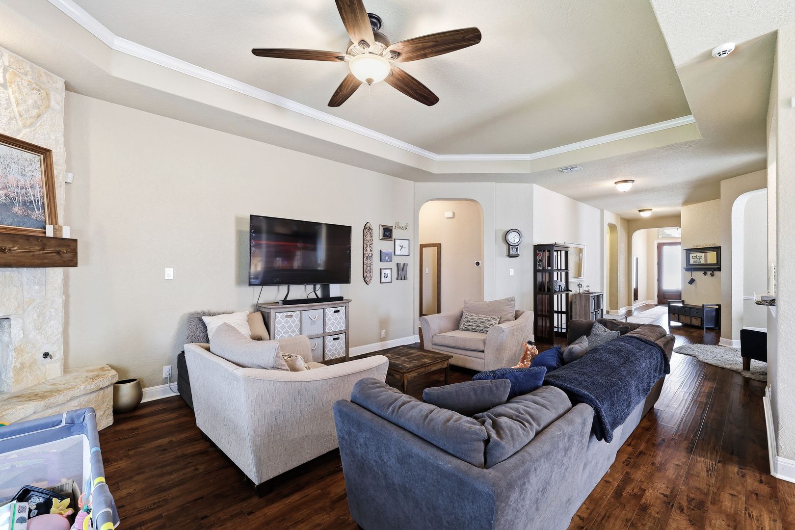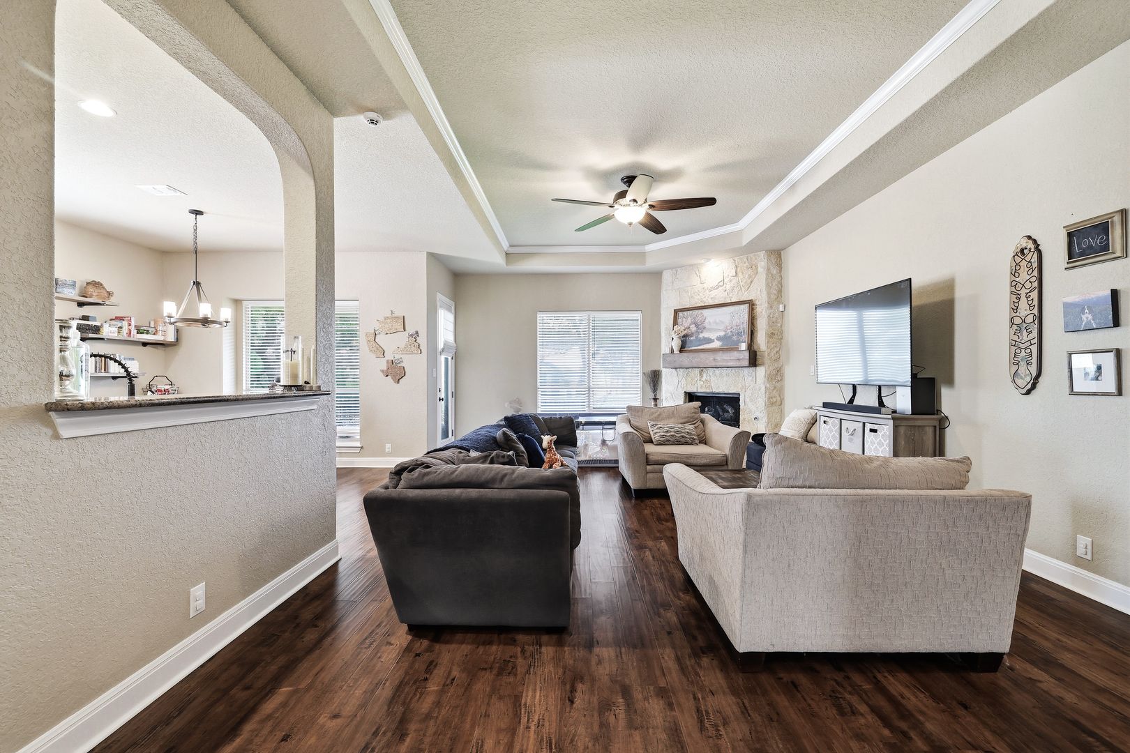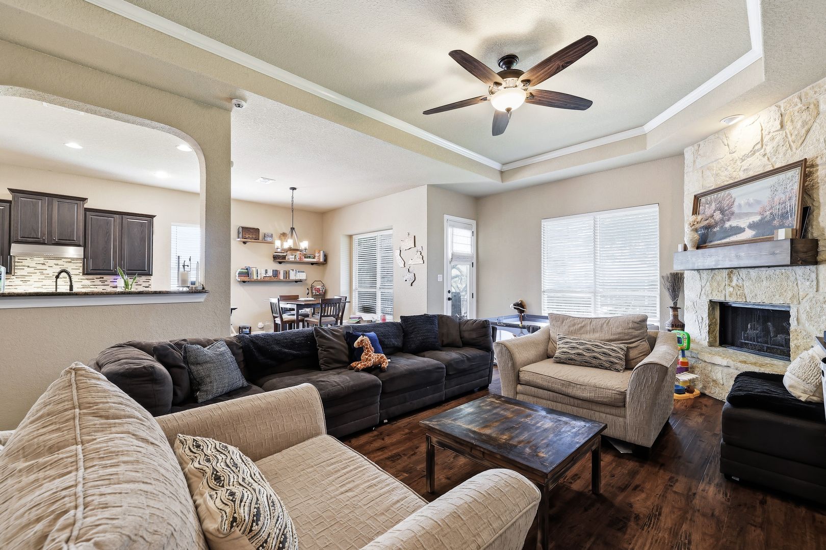 The living room features a striking stone gas fireplace, adding warmth and character. The primary suite includes coffered ceilings, a well-appointed en suite bath, and a walk-in closet. A secondary bedroom with its own en suite bath enhances the layout, making this a full four-bedroom, three-bathroom home.