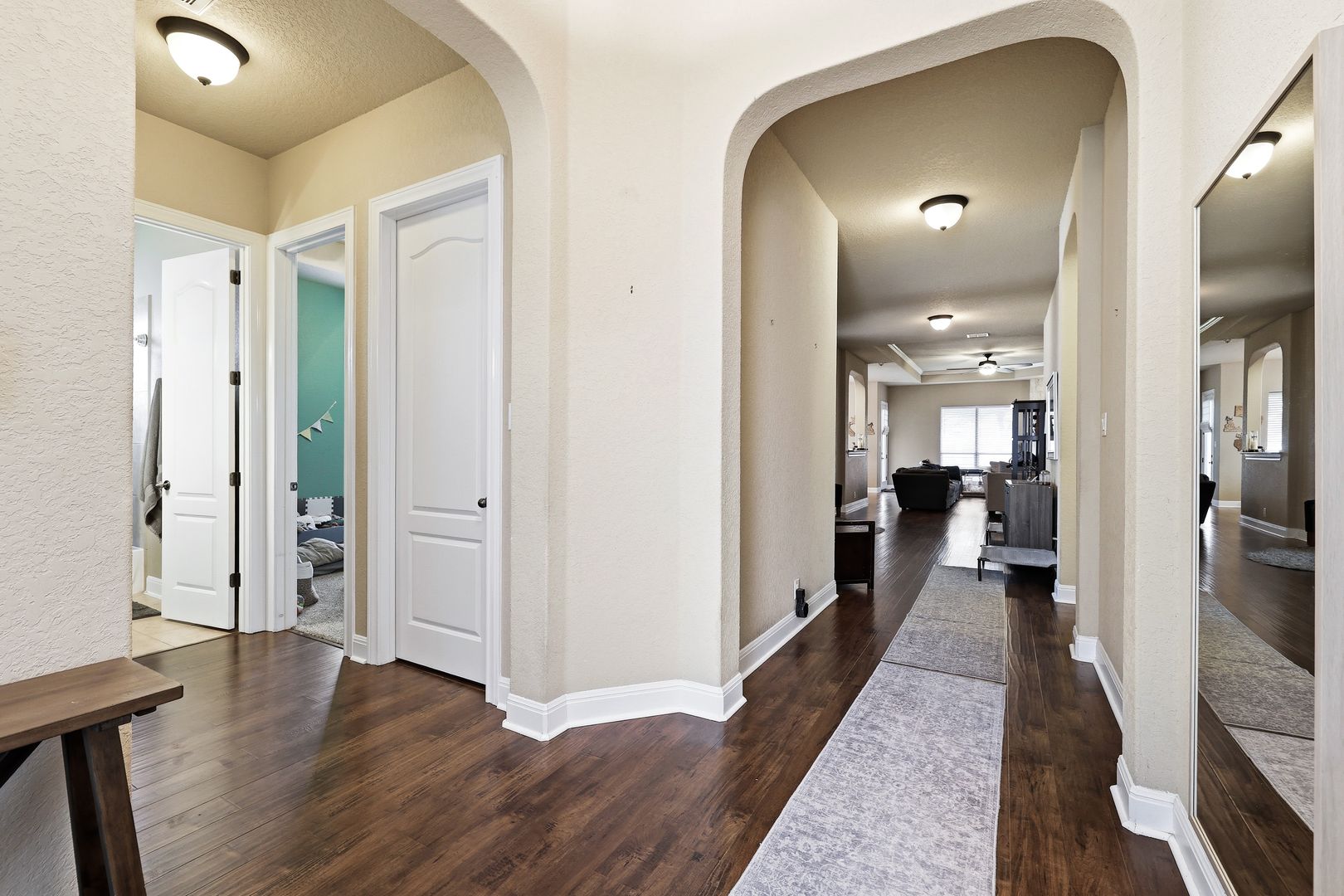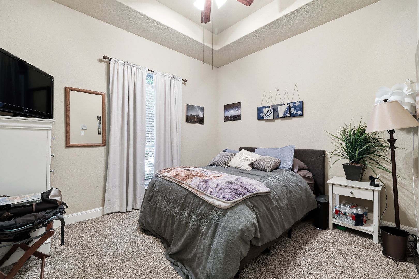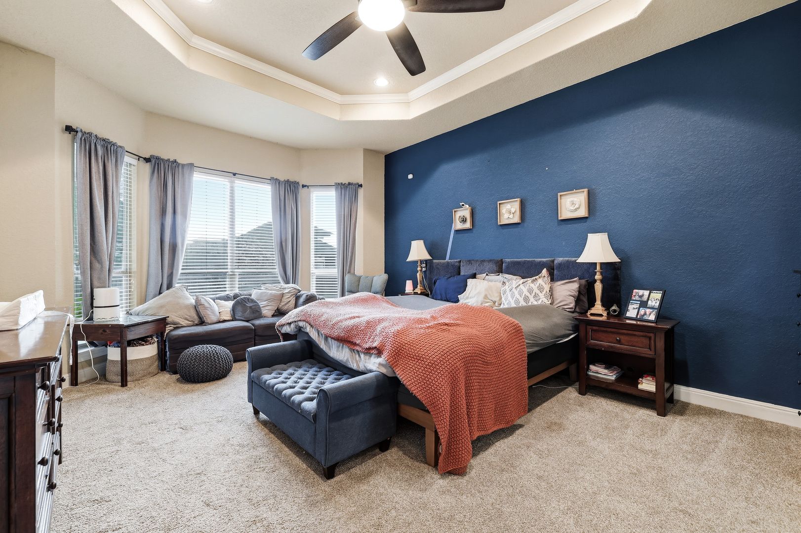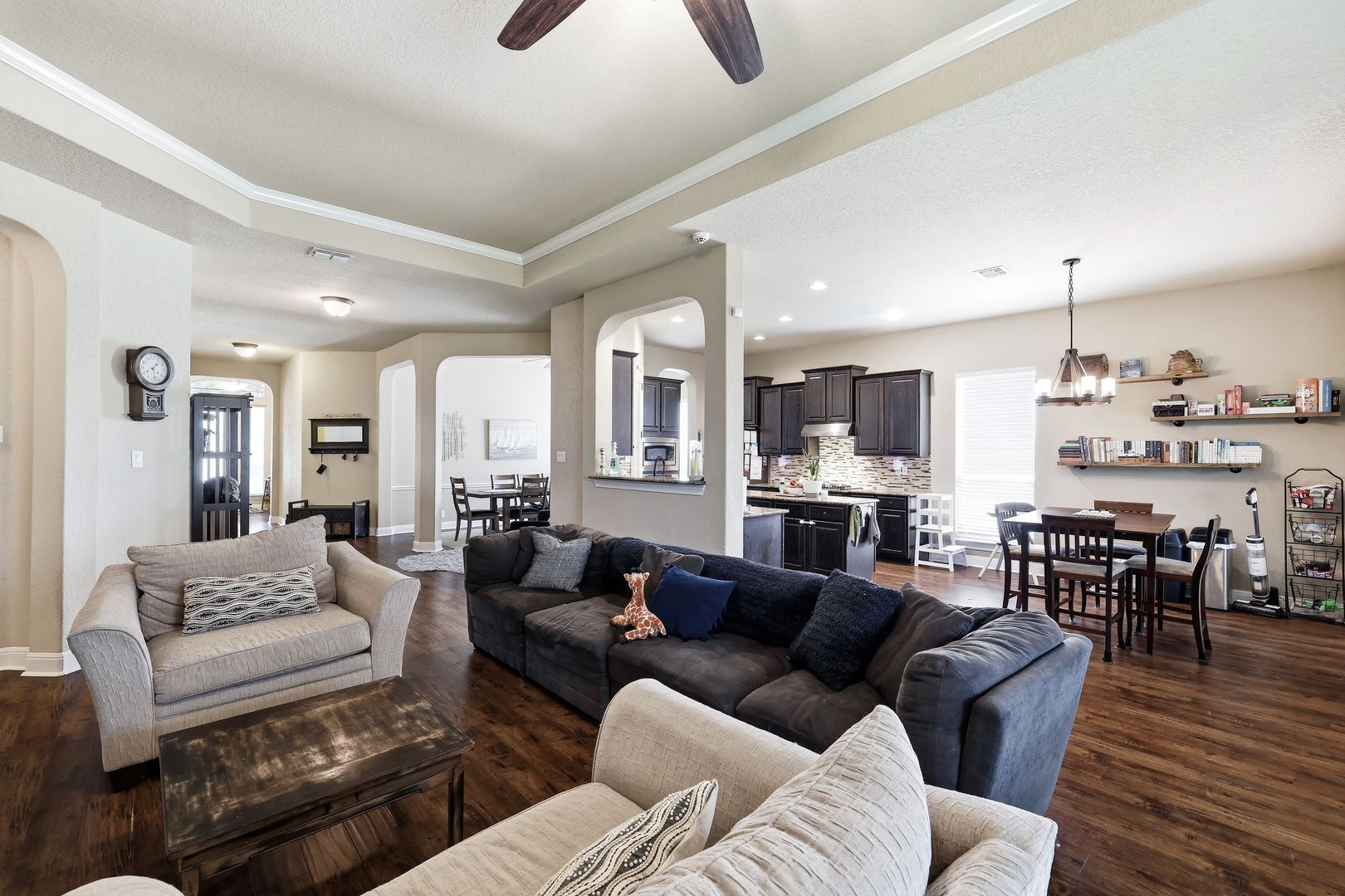The living room features a striking stone gas fireplace, adding warmth and character. The primary suite includes coffered ceilings, a well-appointed en suite bath, and a walk-in closet. A secondary bedroom with its own en suite bath enhances the layout, making this a full four-bedroom, three-bathroom home.