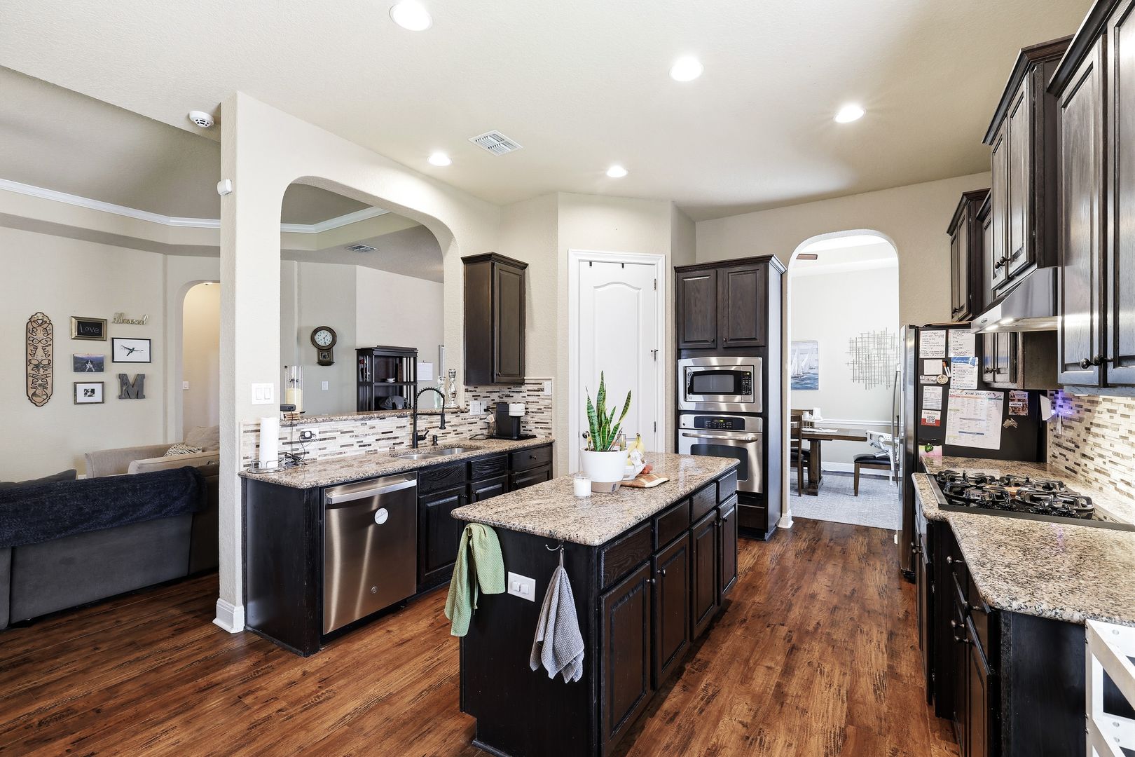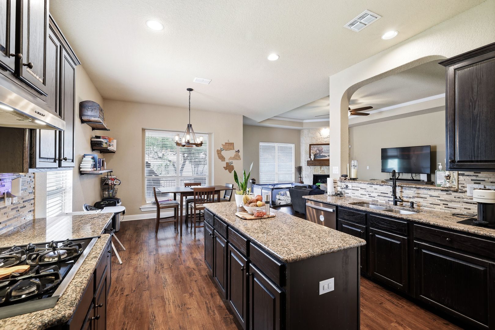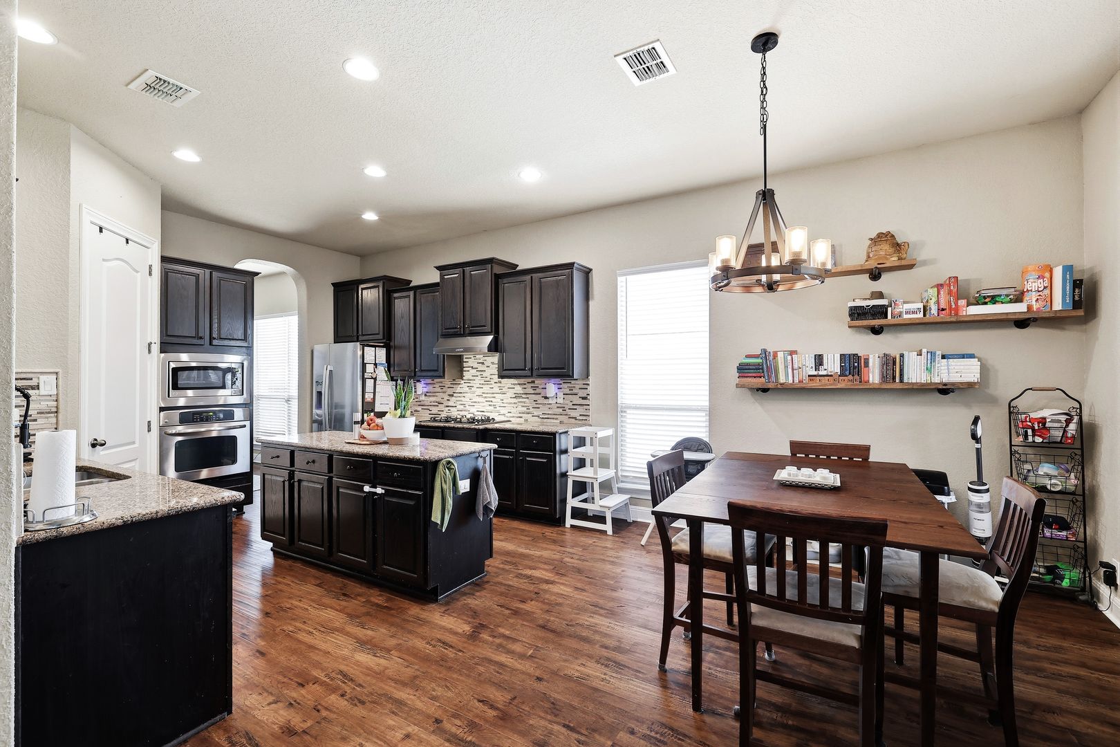 Discover this single-story home with a three car garage in the desirable RedBird Ranch community, offering high ceilings and an open-concept layout. A formal dining area flows seamlessly into the living space and kitchen, creating a functional and connected main living area. The kitchen is well-equipped with a built-in oven and microwave, gas cooktop, refrigerator, and a center island, along with a breakfast nook that provides additional dining flexibility.