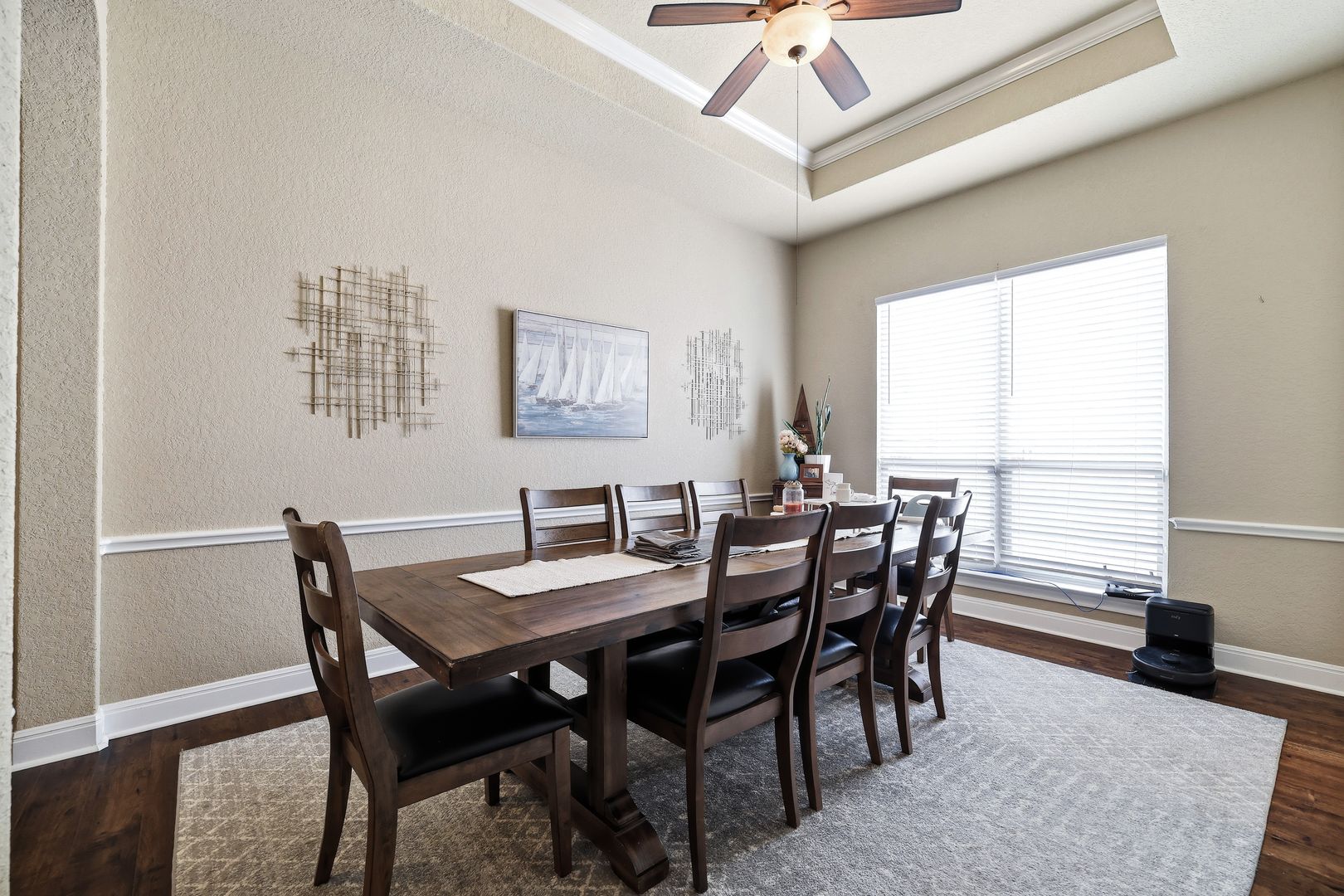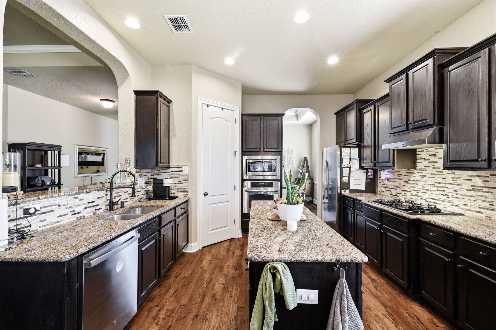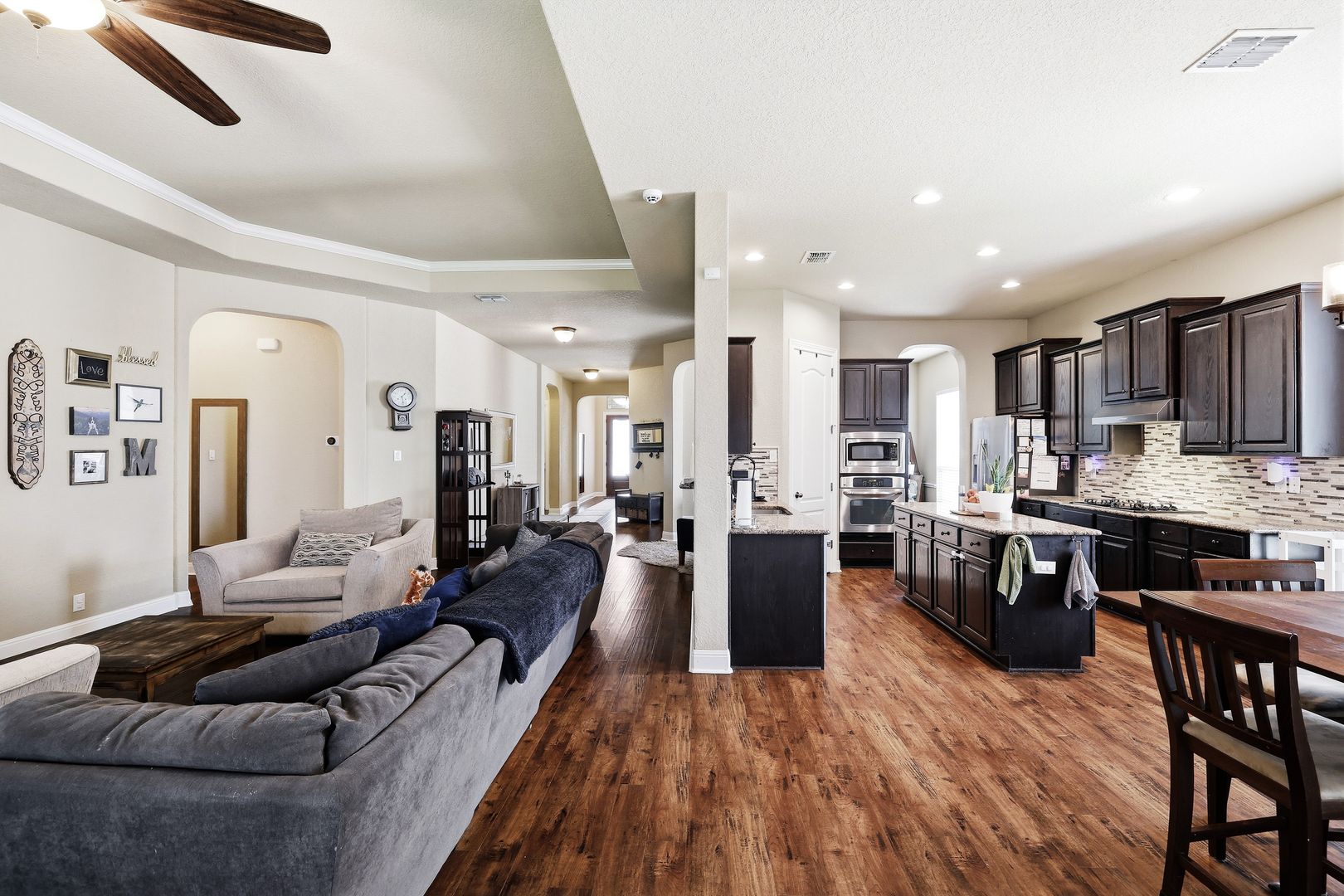 Discover this single-story home with a three car garage in the desirable RedBird Ranch community, offering high ceilings and an open-concept layout. A formal dining area flows seamlessly into the living space and kitchen, creating a functional and connected main living area. The kitchen is well-equipped with a built-in oven and microwave, gas cooktop, refrigerator, and a center island, along with a breakfast nook that provides additional dining flexibility.