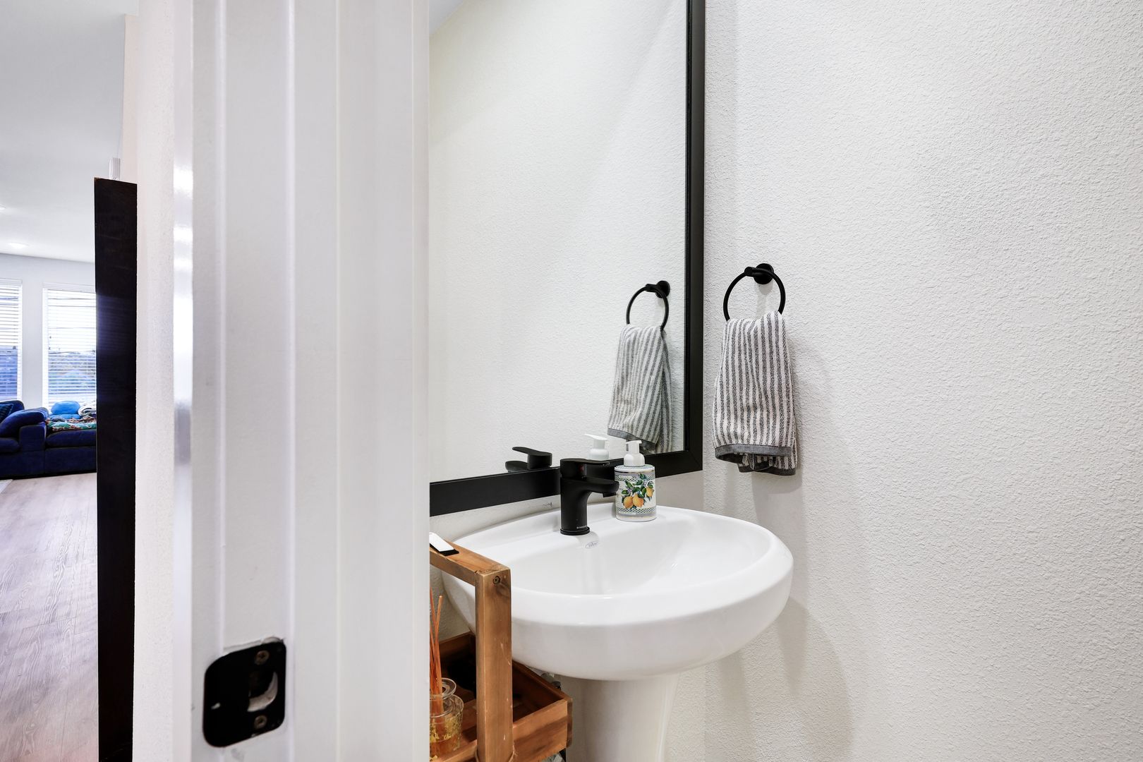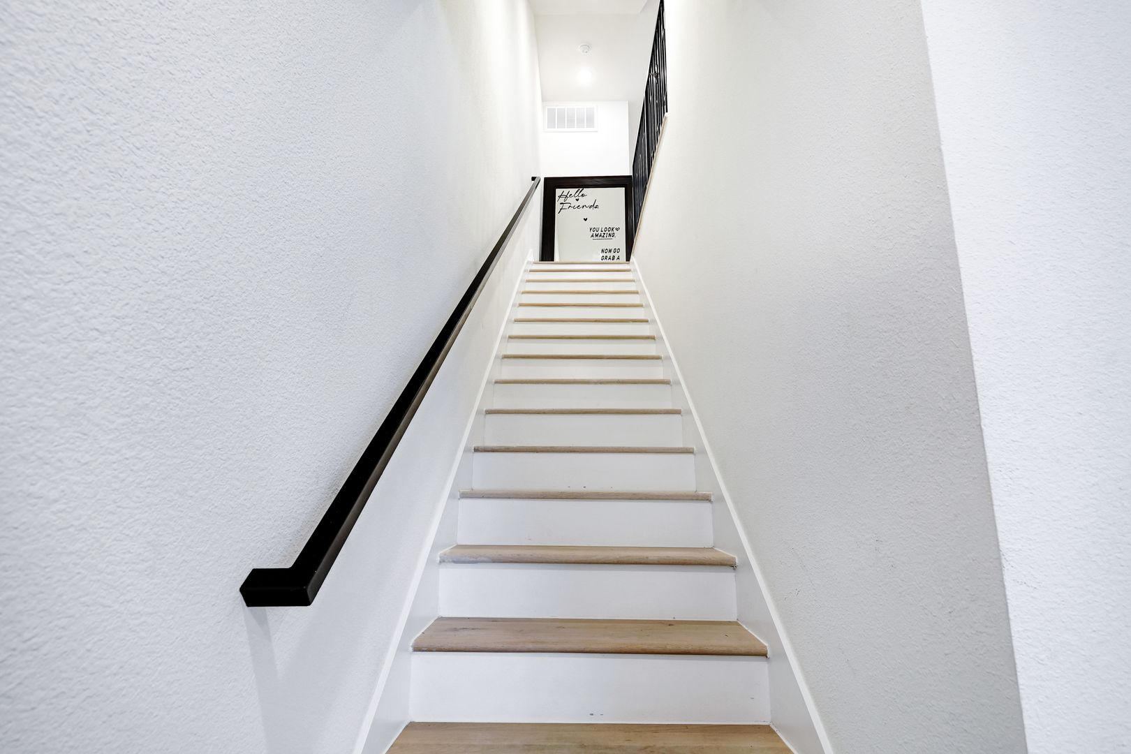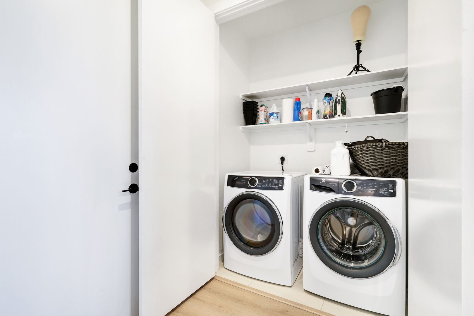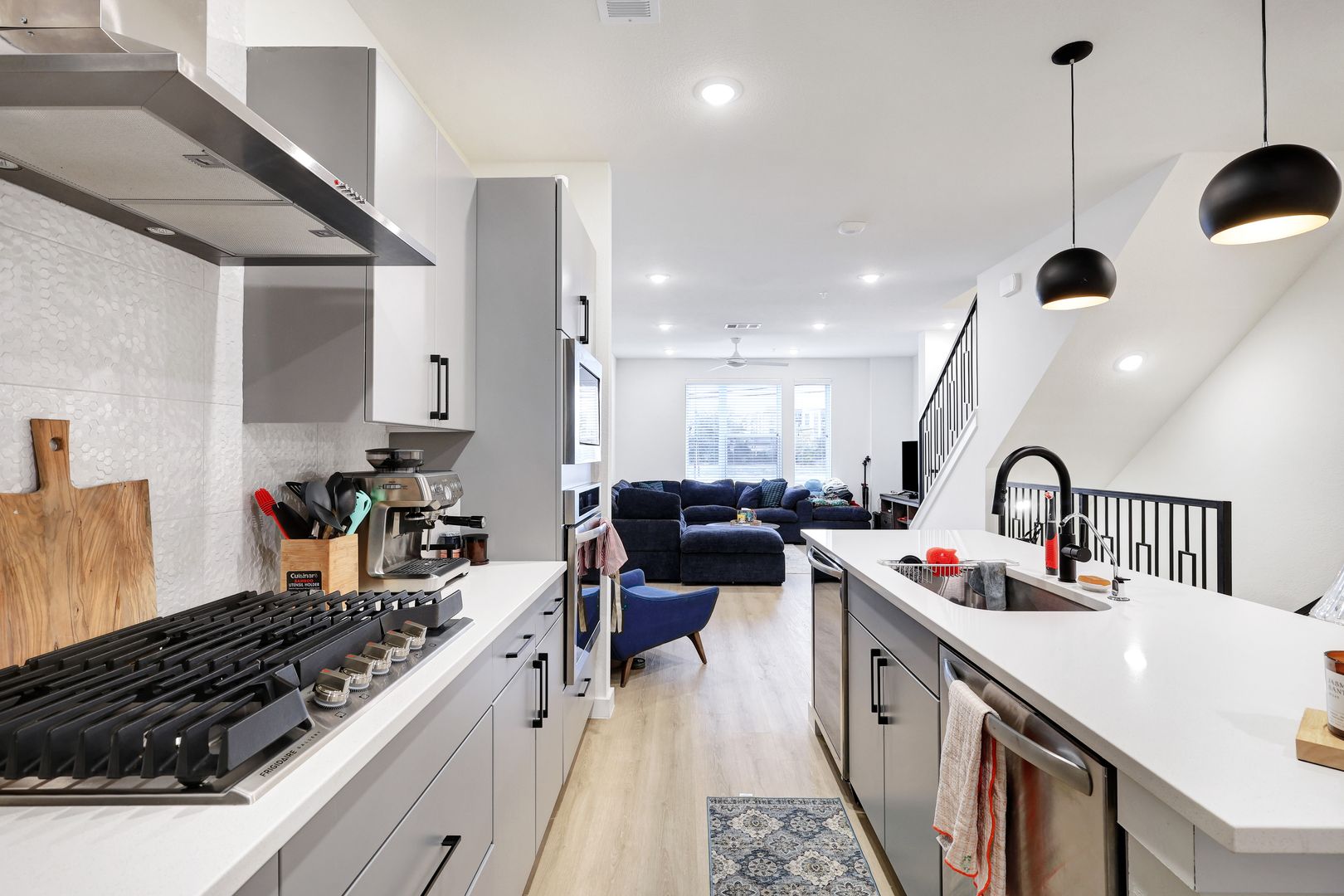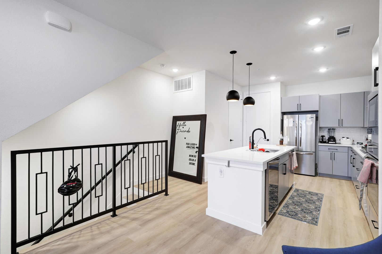 The first floor offers a convenient utility closet complete with washer and dryer, along with a versatile flex space ideal for a home office, workout area, or media lounge. On the second level, enjoy a sleek and modern living space anchored by a striking island kitchen featuring a gas cooktop, built-in oven, and included refrigerator—perfect for both everyday living and entertaining.
