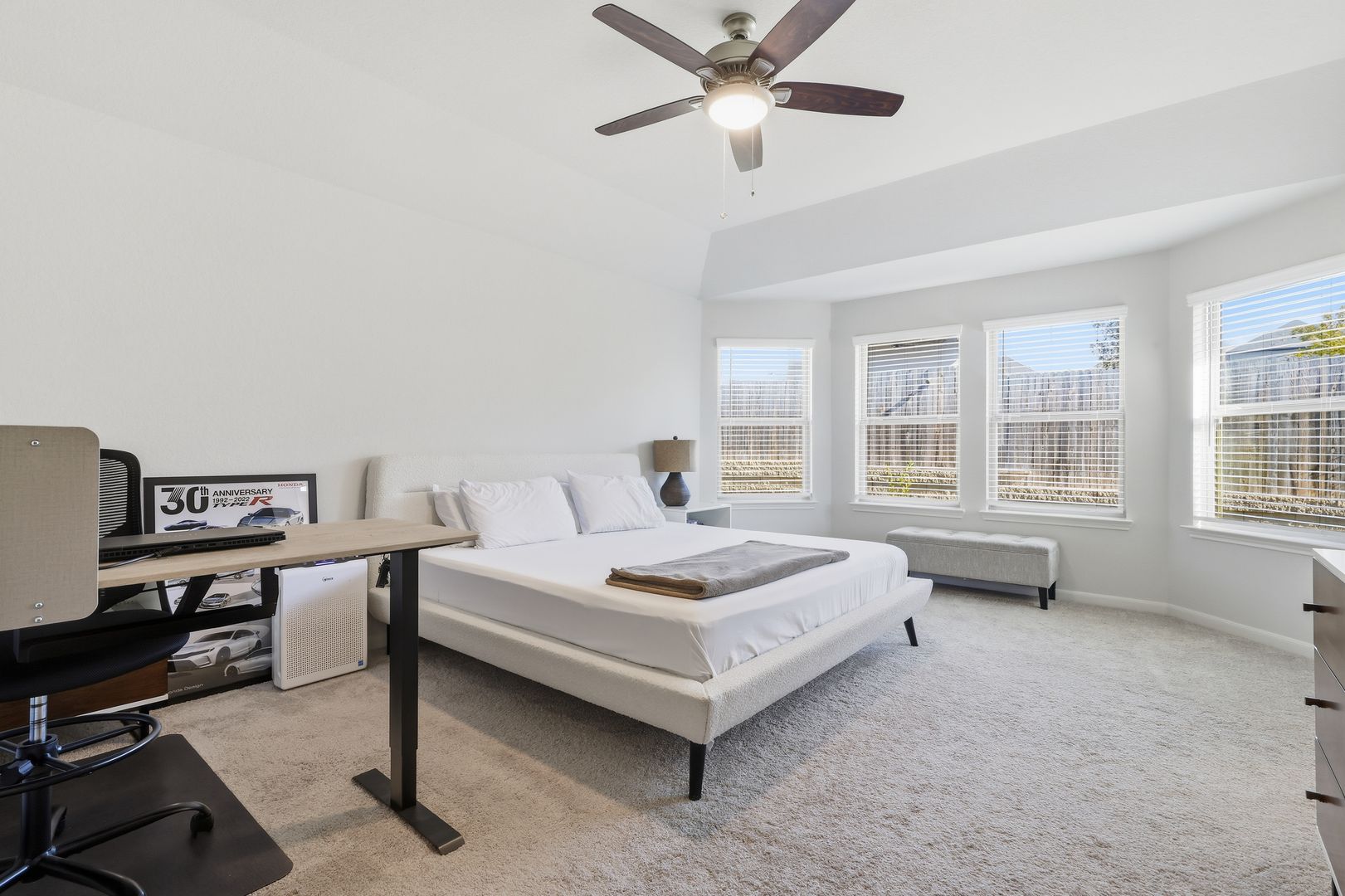 The main living area is a standout, showcasing a large center island that doubles as bar-stool seating and a well-appointed kitchen equipped with a gas stove—perfect for cooking enthusiasts. The private primary suite features beautiful windows overlooking the backyard and an impressive en suite complete with a walk-in shower.